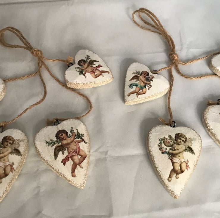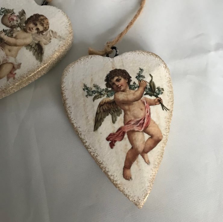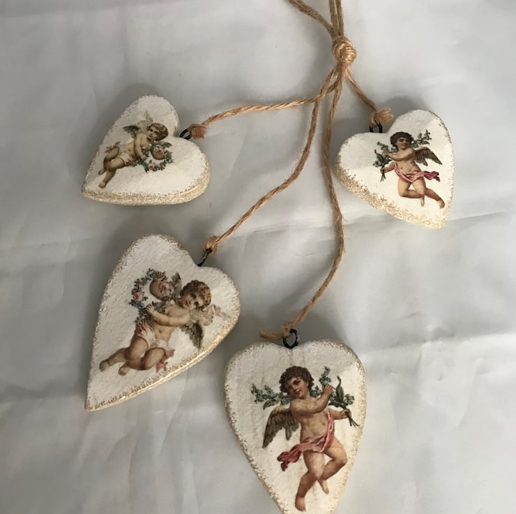 The hearts have been painted, and then sponge painted to give an older, more rustic look, and decorated with rice paper images of cherubs on the front and a small, simple star design (from a paper napkin) on the reverse.