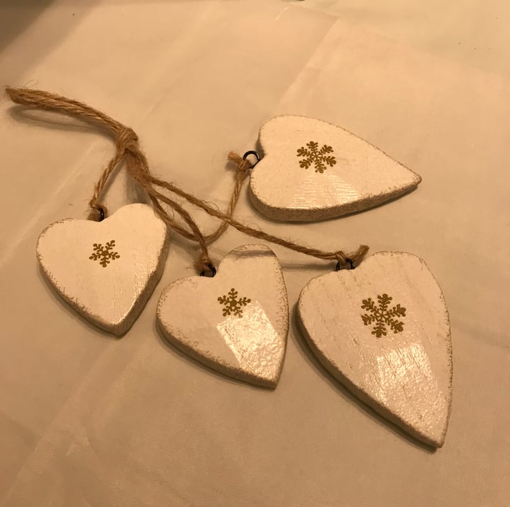 The decoration comprises four small wooden hearts, in two different sizes, on twine.