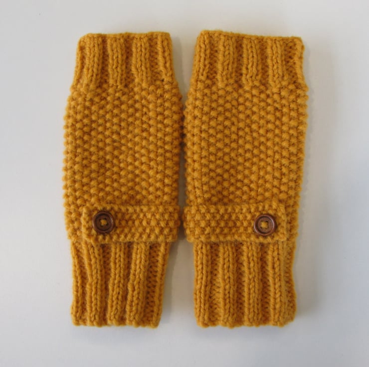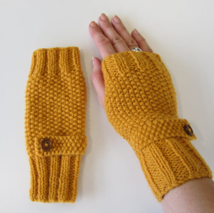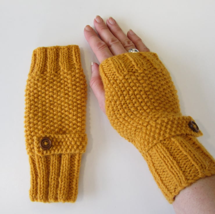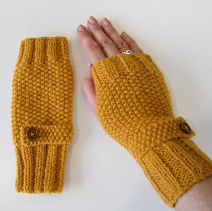 These mustard fingerless mittens / wrist warmers / gloves are knitted in a rib and moss stitch pattern and are hand knitted in a lovely and warm Aran wool, which comprises of 25% pure wool and 75% acrylic wool.