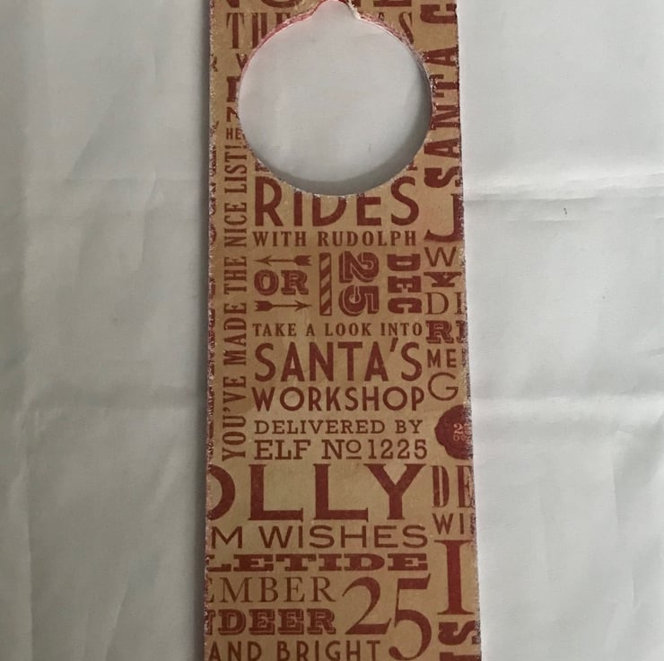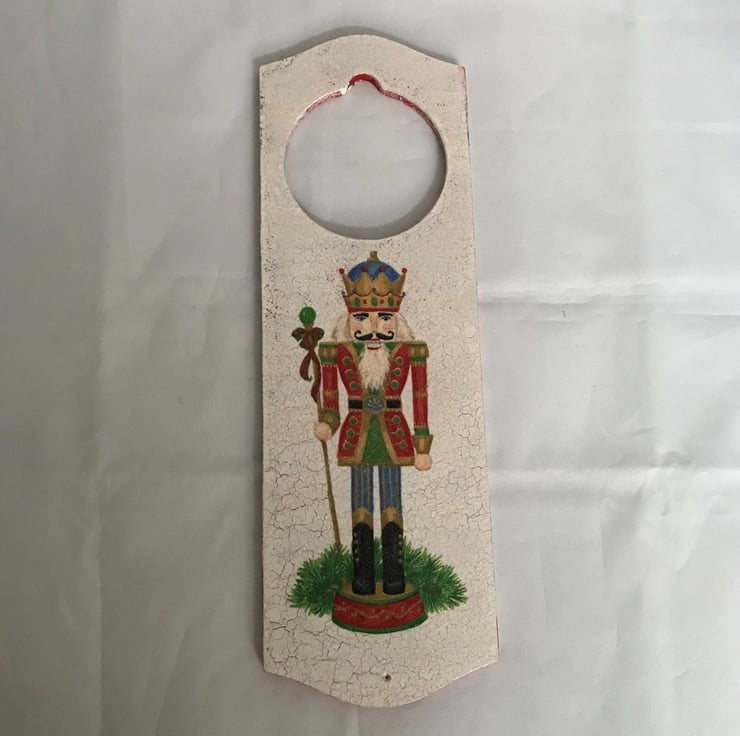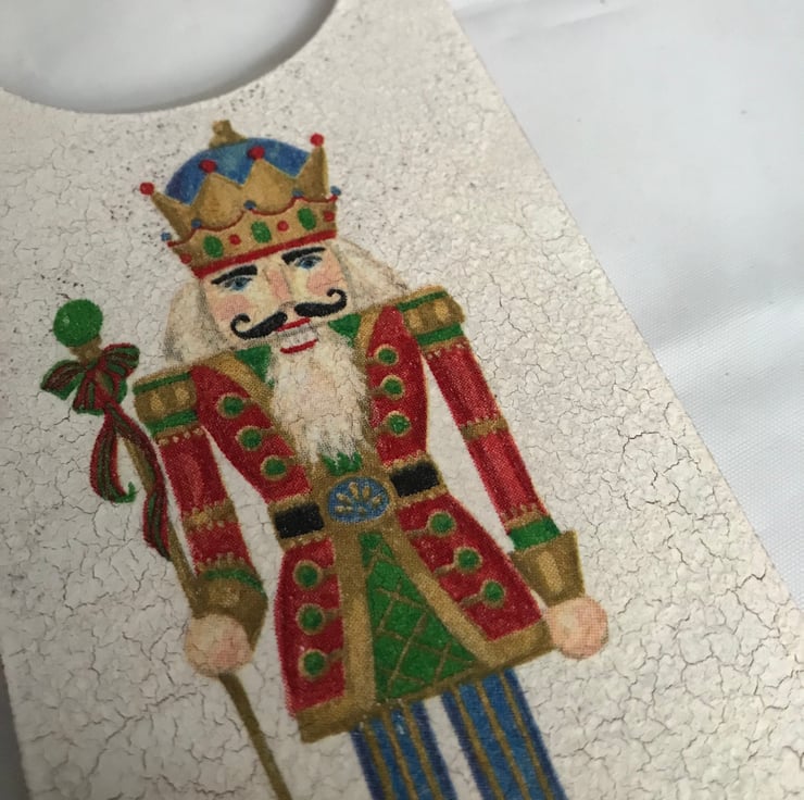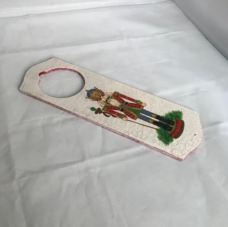 The hanger has been painted and crackled on the front before adding the crisp (paper napkin) image of the Nutcracker, whilst the reverse is covered in a vintage-look paper (muted red and brown) of festive greetings.