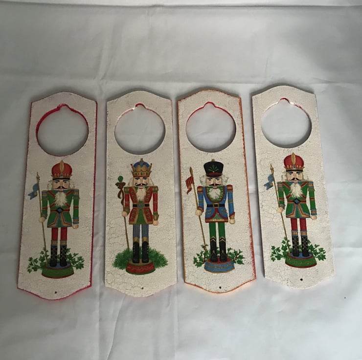 I am separately listing four of these hangers, with regard to the Nutcracker’s uniform being one of three different colours and the hanger edging having been sponge-painted in either a red, white or gold mix, so that you can more easily choose your preferred colourway.