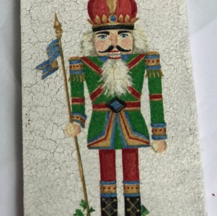 The hanger has been painted and crackled on the front before adding the crisp (paper napkin) image of the Nutcracker, whilst the reverse is covered in a vintage-look paper (muted red and brown) of festive greetings.