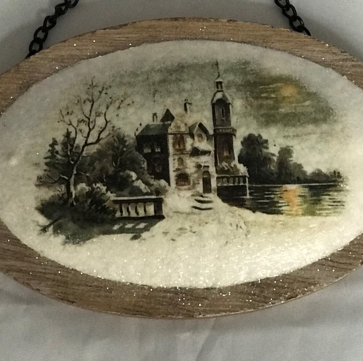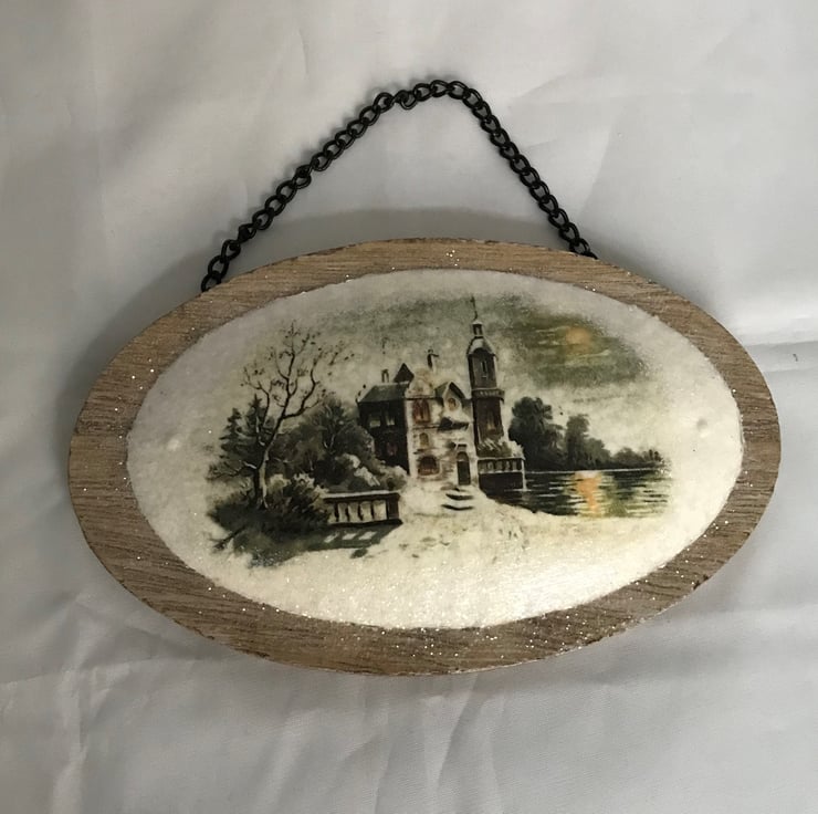 A most unusual, vintage snow scene, hanging decoration, made from an oval wood shape with a smaller oval metal shape fixed to it (with an attractive tiny fixing visible on each side of the metal), and with a black chain.