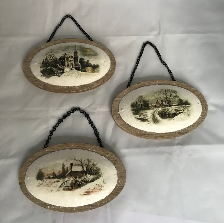 Vintage Snow Scene Medallion Hanging Decorations Wood & Metal Lake