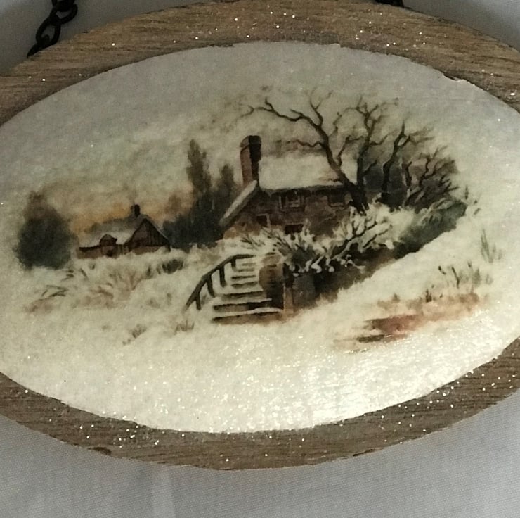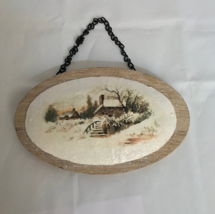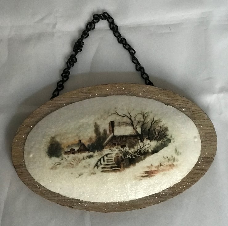 A most unusual, vintage snow scene, hanging decoration, made from an oval wood shape with a smaller oval metal shape fixed to it (with an attractive tiny fixing visible on each side of the metal), and with a black chain.