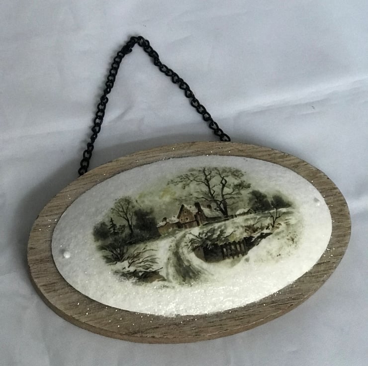 A most unusual, vintage snow scene, hanging decoration, made from an oval wood shape with a smaller oval metal shape fixed to it (with an attractive tiny fixing visible on each side of the metal), and with a black chain.