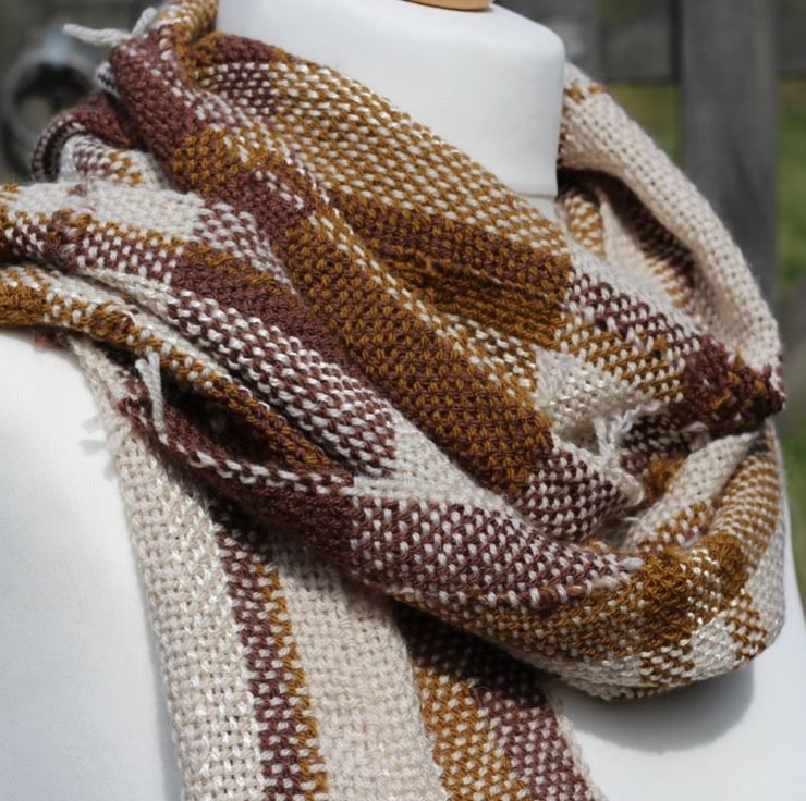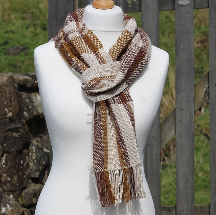 This handwoven scarf has a mixture of different yarns from various fibres.