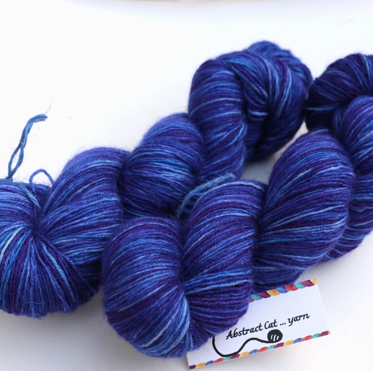 Blue with purple/violet and some lighter blue sections. This Bluefaced Leicester superwash yarn is soft with a very slight lustre. There are two skeins available (price shown is for one). Photos taken and edited in bright but wintery natural light.