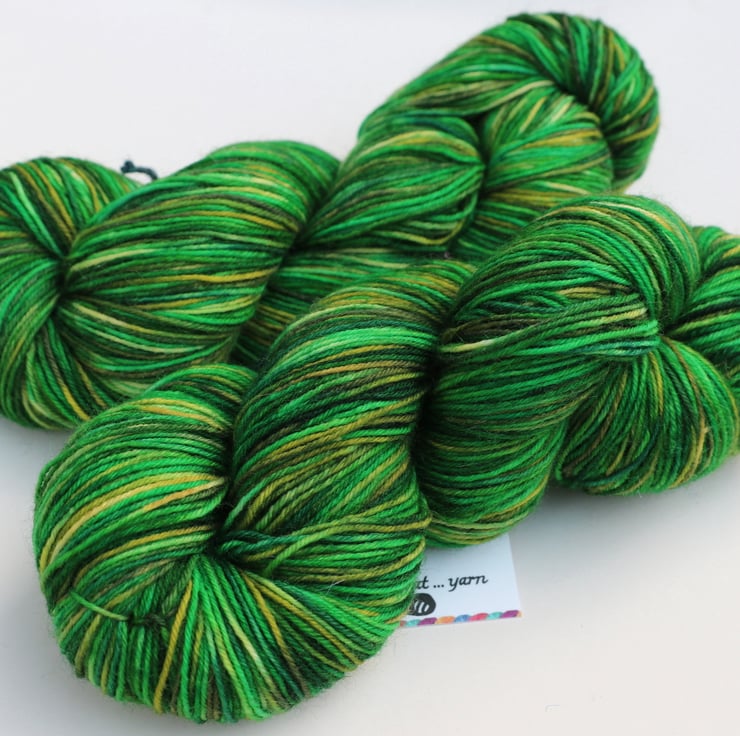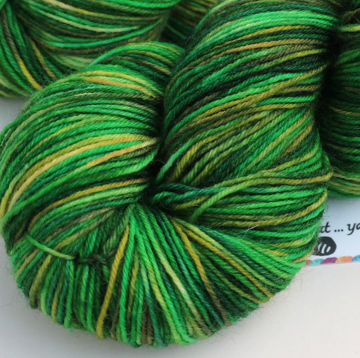 Emerald, leaf and yellow-greens. This yarn is an enigma because I'm not sure what it is. It feels like 100% superwash BFL but I found it in a bag of Superwash merino/nylon. Therefore I am offering it at a special reduced price. Photos taken and edited in bright but wintery natural light.