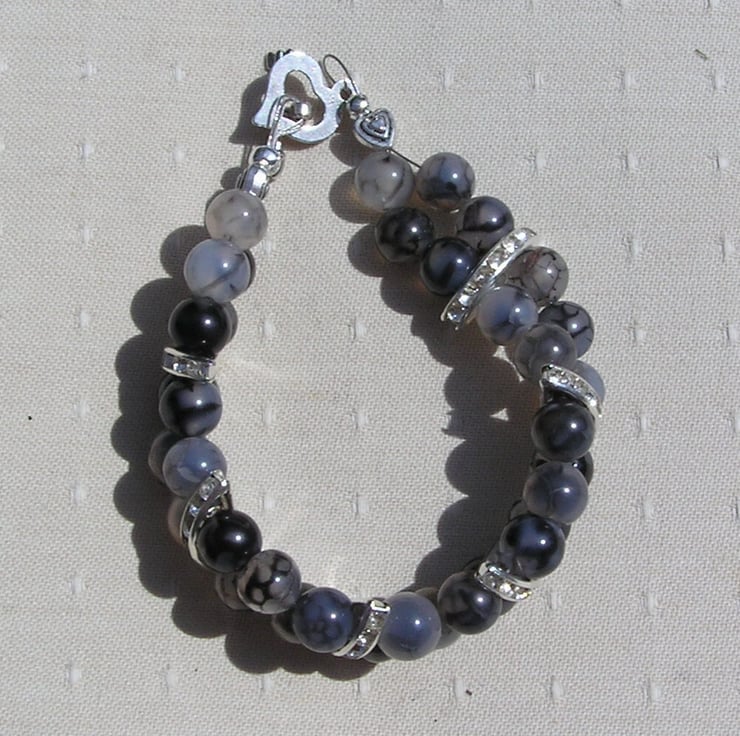 This Stunning Bracelet is made from Black Veined Agate round Beads, grouped together in Fives separated by a spacer bar studded with Glistening Crystals positioned at an angle - The makings & Veining are unique to each bead... no Two are the same