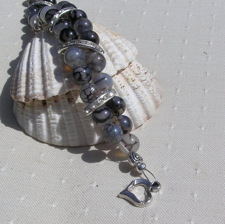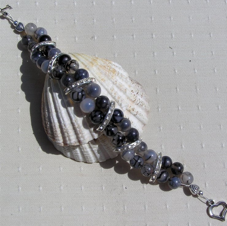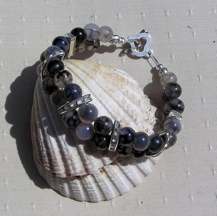This Stunning Bracelet is made from Black Veined Agate round Beads, grouped together in Fives separated by a spacer bar studded with Glistening Crystals positioned at an angle - The makings & Veining are unique to each bead... no Two are the same