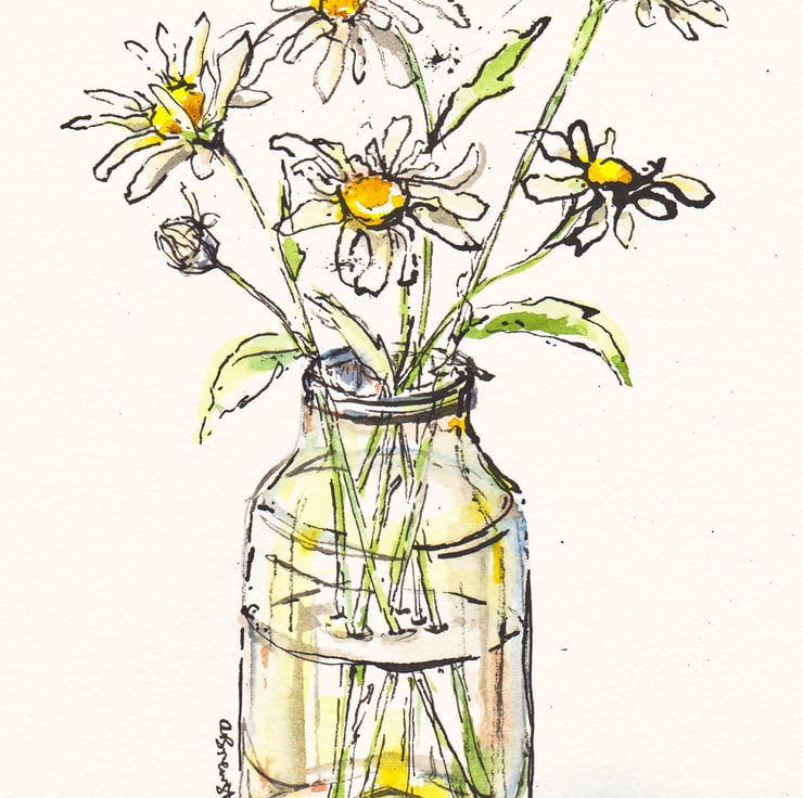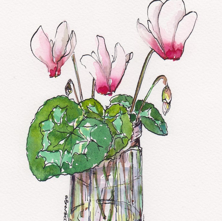 These are a set of watercolour and ink paintings that I made over a year, many of them of the little vintage pots and bottles I have found whilst digging about in the mud near where I live. They are the perfect size for a single bloom!