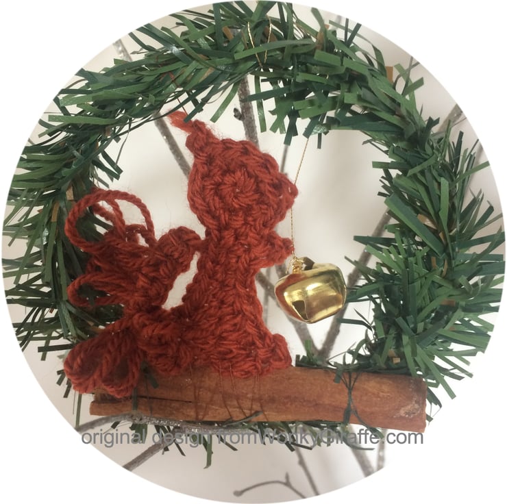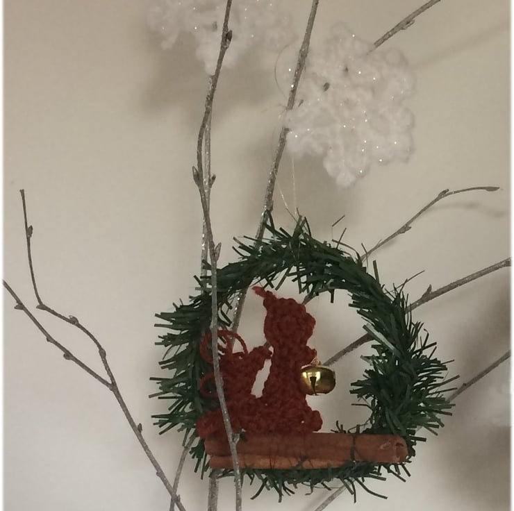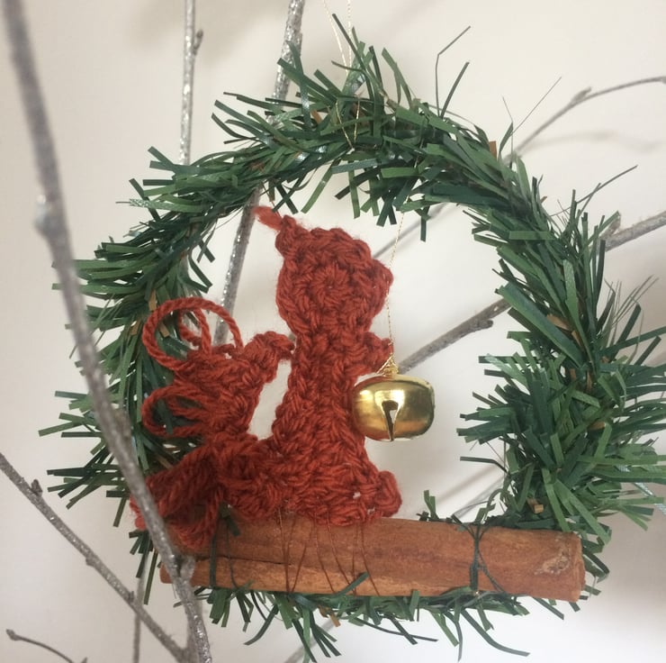 I am lucky enough to see these beautiful and elusive creatures in my garden occasionally. They are so entertaining, and so fast (blink and they have disappeared)! I designed this little crochet version inspired by them; and for Christmas I have popped him in a fir tree hoop with a little bell "acorn"!.