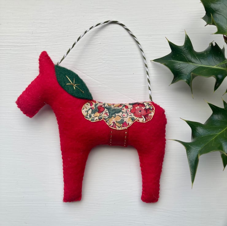 The hand painted and carved wooden Swedish dala horses evoke an image in my mind of a more traditional time when the pace of life was slower. I wanted to capture this feeling and timeless folk design in a felt Christmas decoration that I hope will become part of your Christmas tradition and be enjoyed for many years to come.