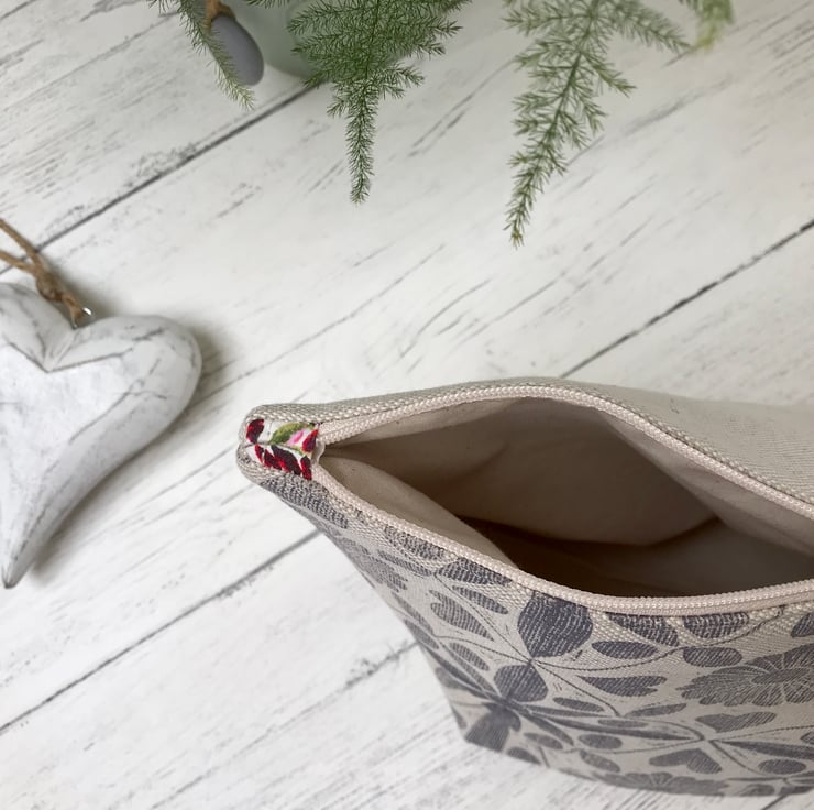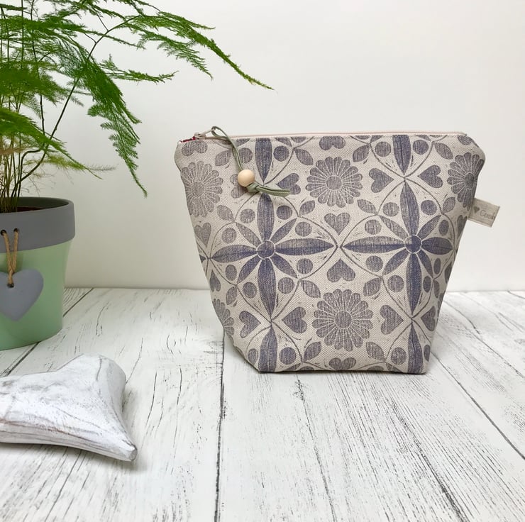 A lovely hand printed zipped Wash bag. This would make an ideal gift or a treat for yourself and is perfect for carrying toiletries and make up