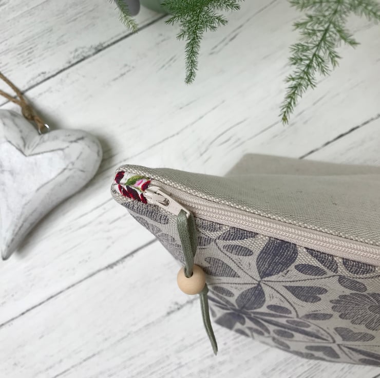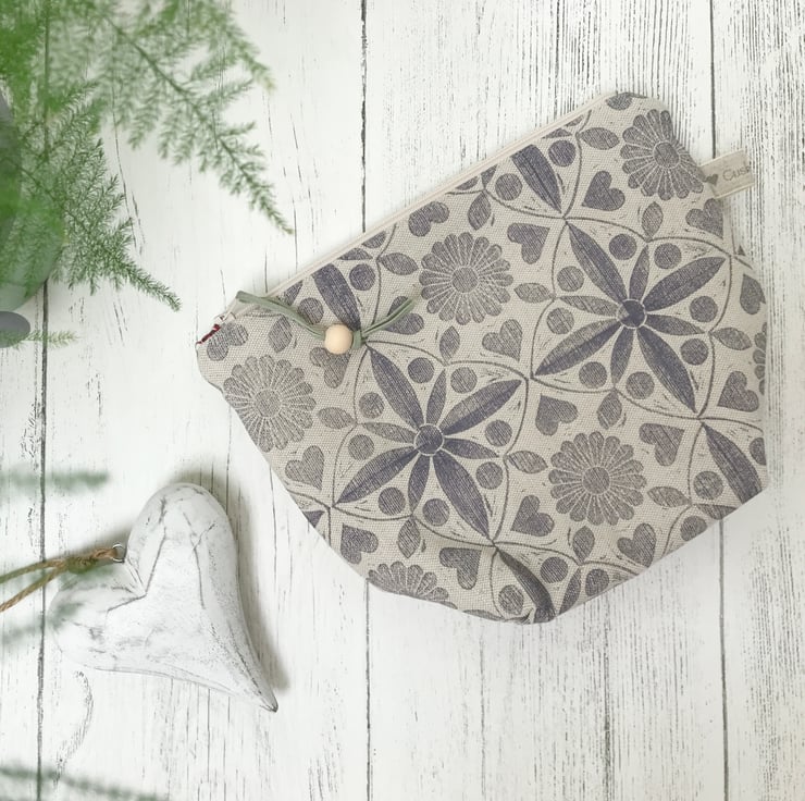 This unique design is block printed by hand using Eco-Friendly inks on to natural linen union fabric woven Scotland. The reverse is plain natural linen union. It is softly padded and lined with biodegradable waterproof calico, and the zipper finished with a pull made from waxed cotton cord and a natural wooden bead