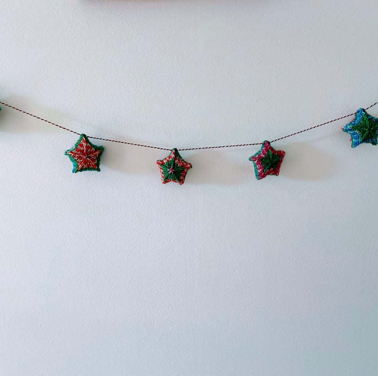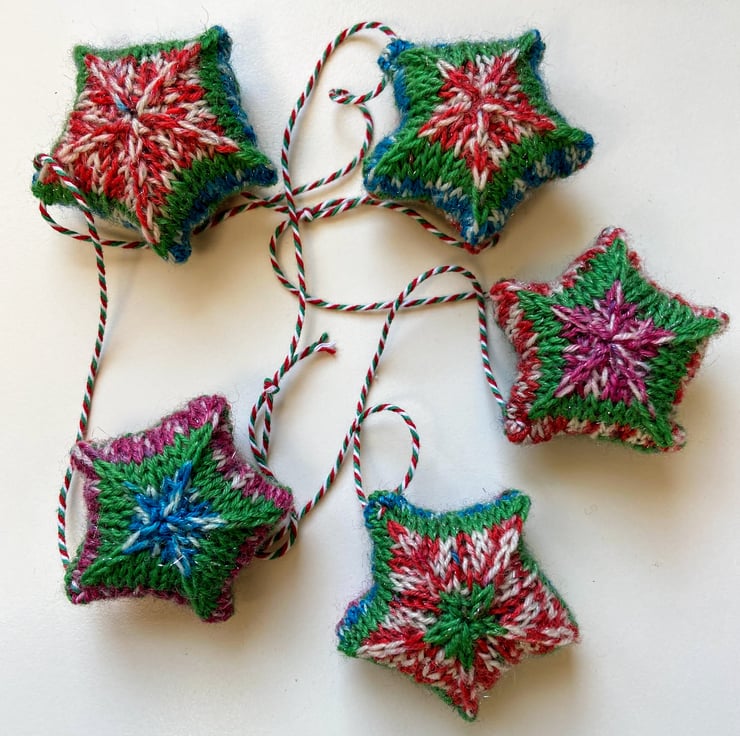 Super cute bunting made from five hand knitted stars and cotton baker's twine. knitted in multicoloured yarn which has a sparkly thread running through it and stuffed using toy grade wool stuffing which conforms to EN71, BS1425, BS5852, each star is slightly different in pattern but all measure approximately 6cm across.