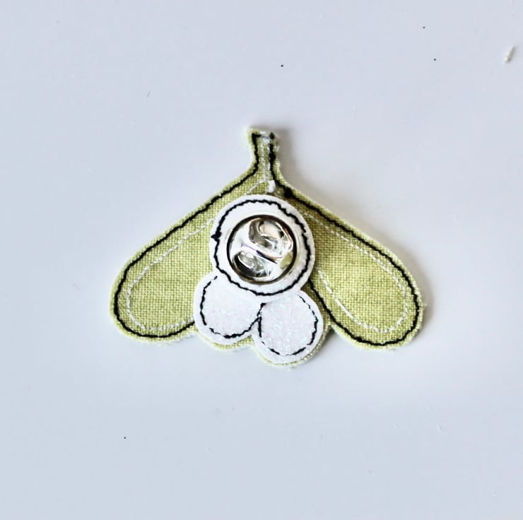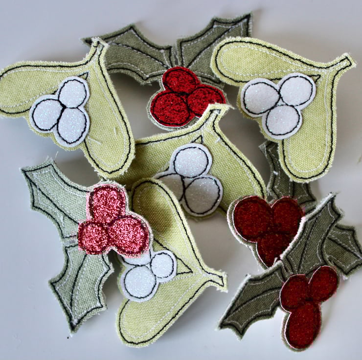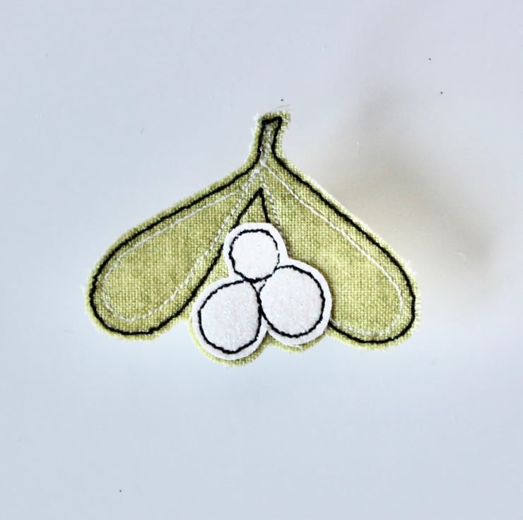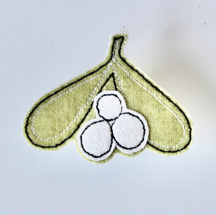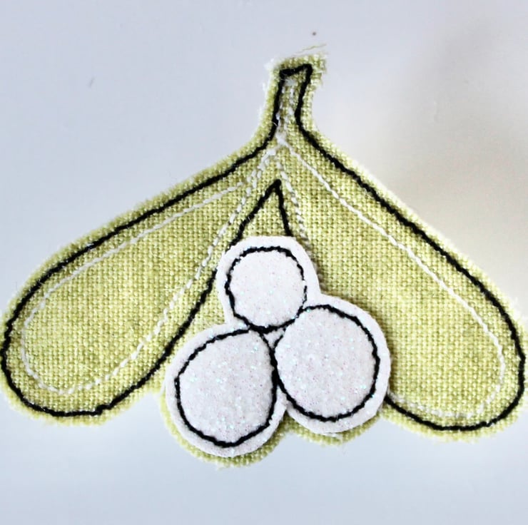 Mistletoe brooches are sewn using cotton cloth, glitter cloth and free hand machine embroidery; multiple layers of cloth are sewn together and cut out by hand using sharp scissors. The pin on the back is attached with hot glue and with a sewn fabric circle to secure.