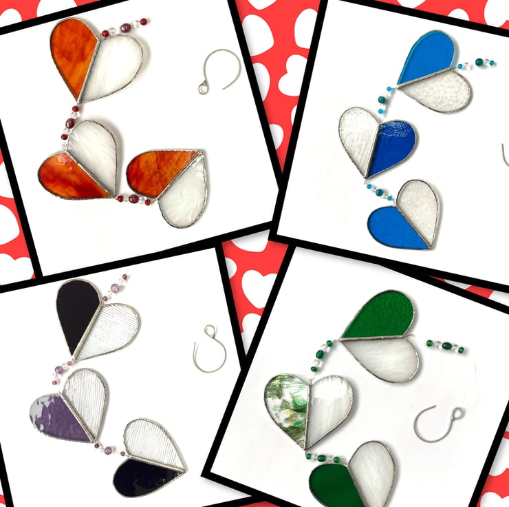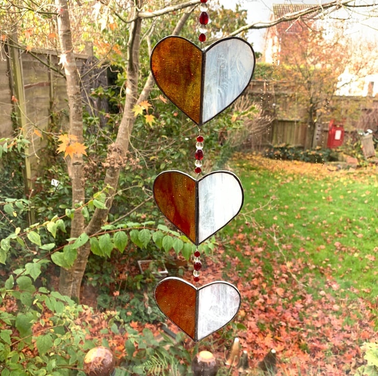 This suncatcher is made from a sting of 3 red and white stained glass hearts strung together with beaded fishing line.