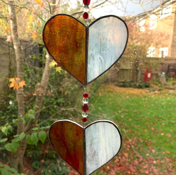 The hearts have been made from red streaky wissmach glass which looks orangey with white wispy sea glass.