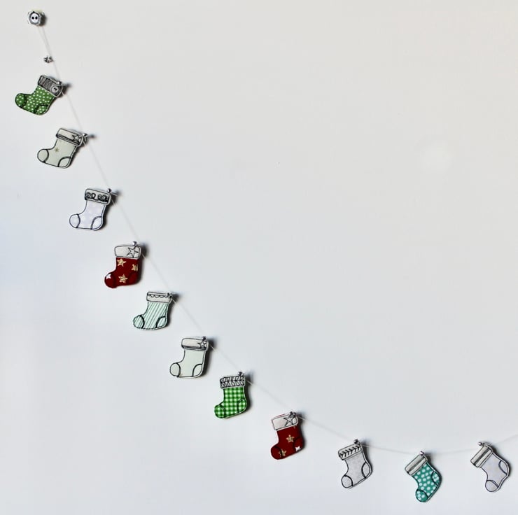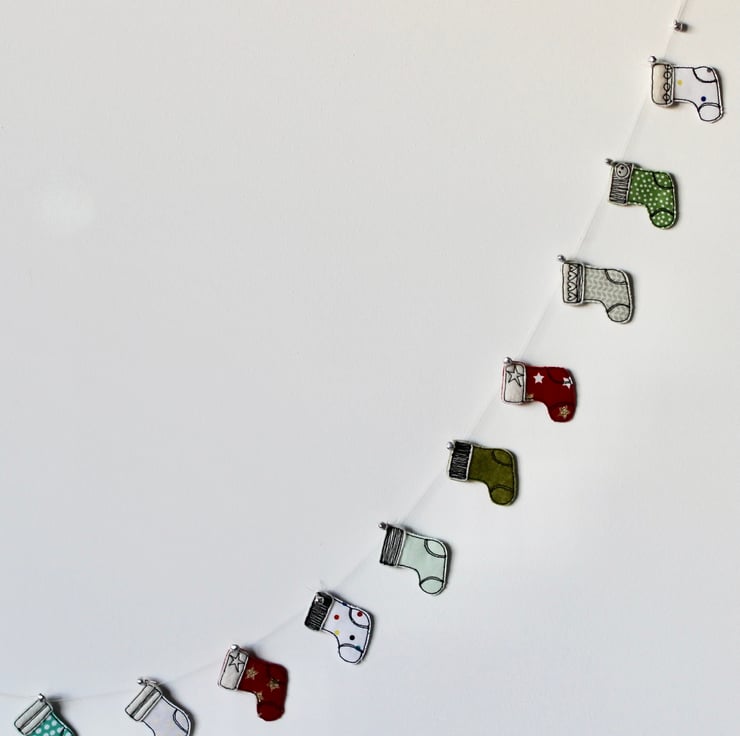 Each of the nineteen stockings suspended along this garland, is sewn using a combination of cotton cloth, glitter cloth, 100% wool felt and free hand machine embroidery; multiple layers of cloth are sewn together and cut out by hand using very sharp scissors.