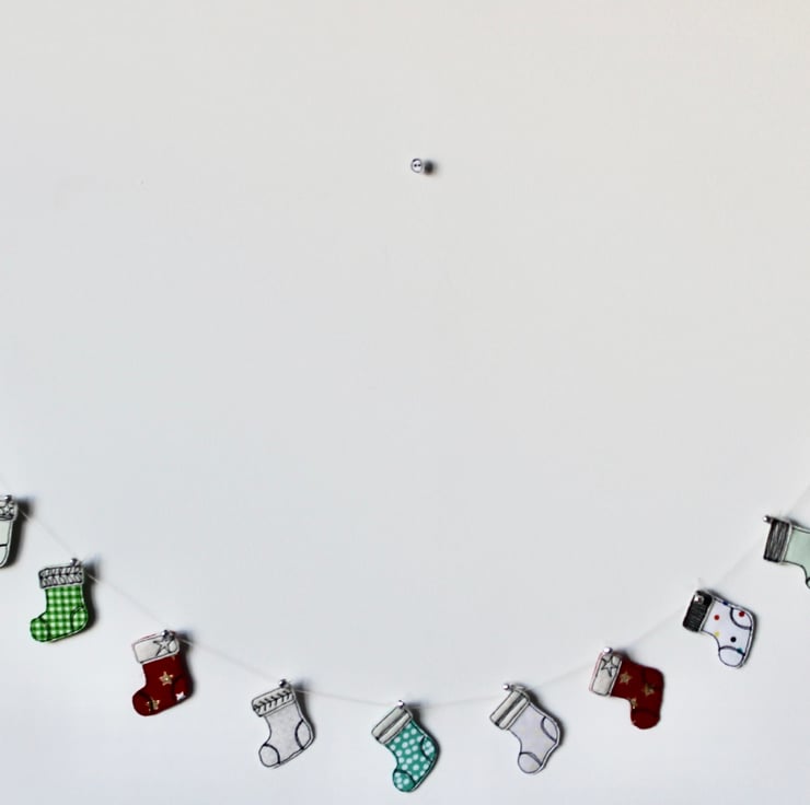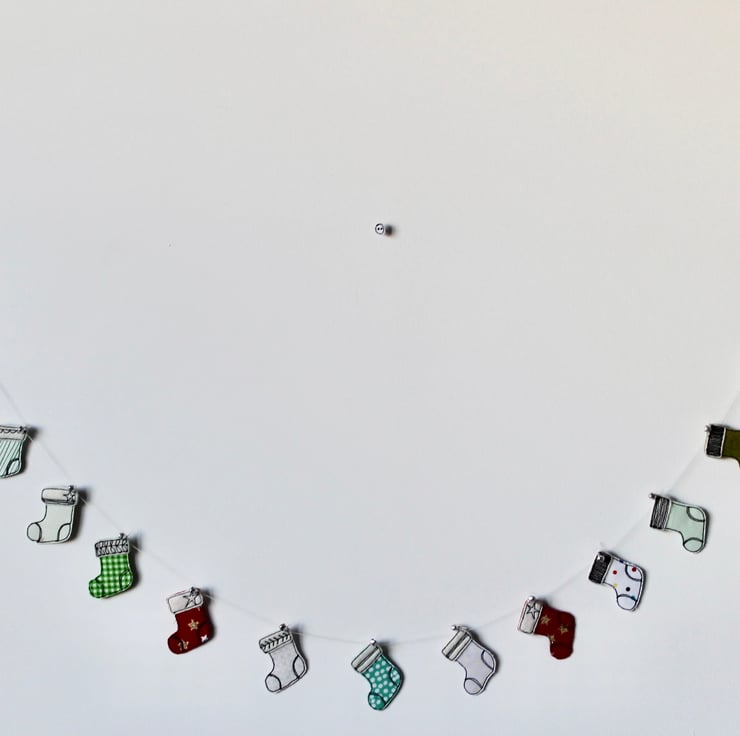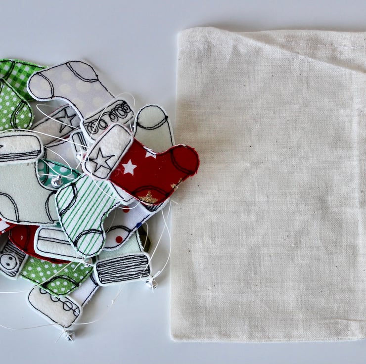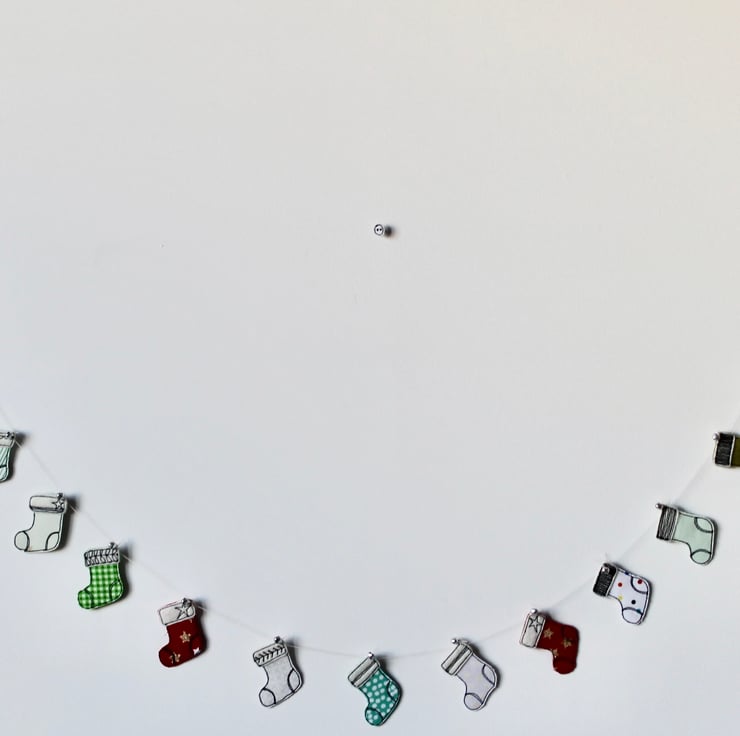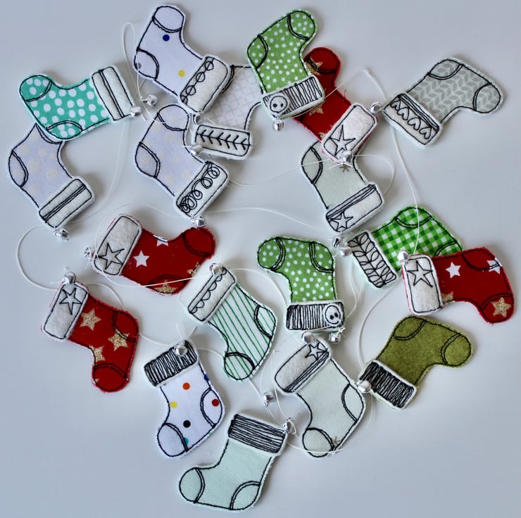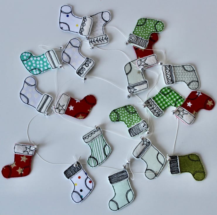 The stockings are suspended on a linen thread and can be moved along the length, allowing a little creativity with spacing. There are silver coloured metal bells in-between each stocking.