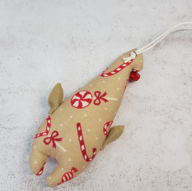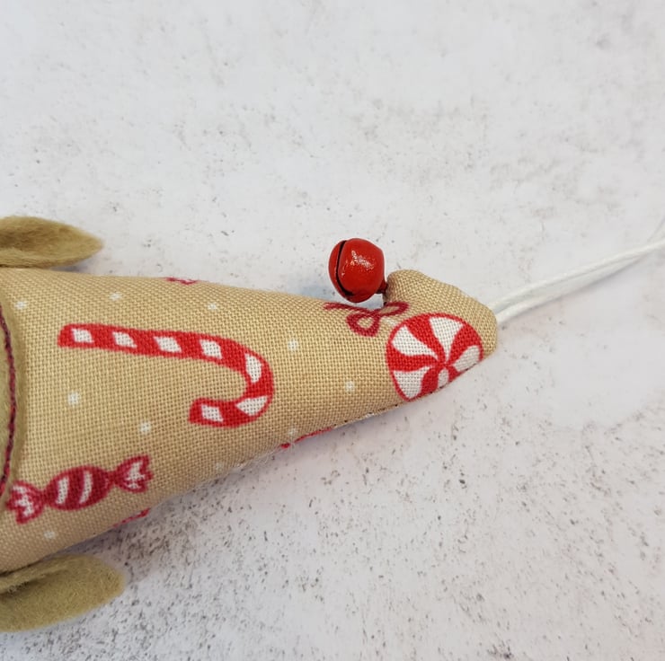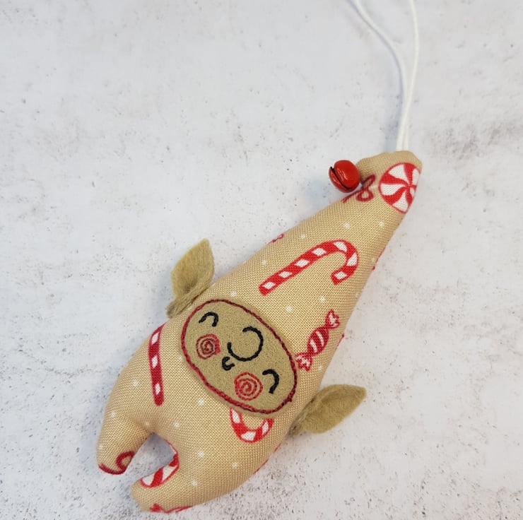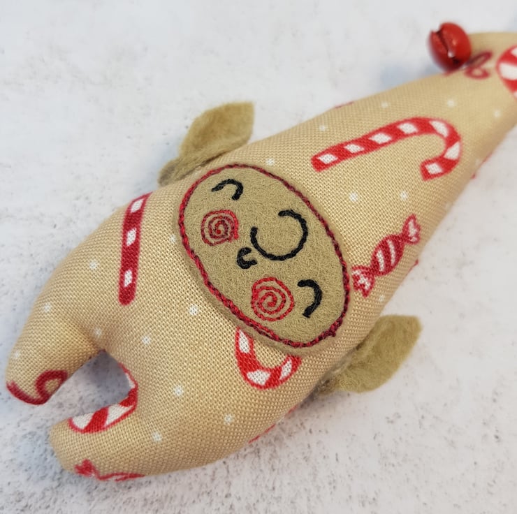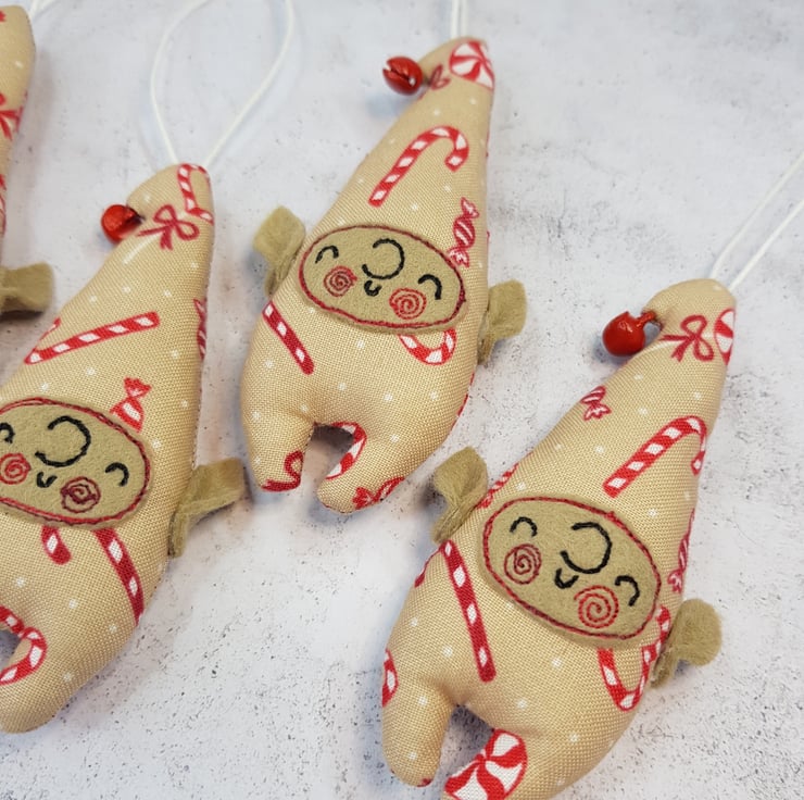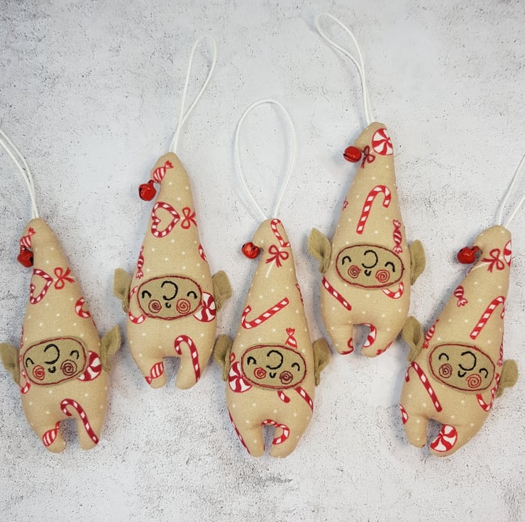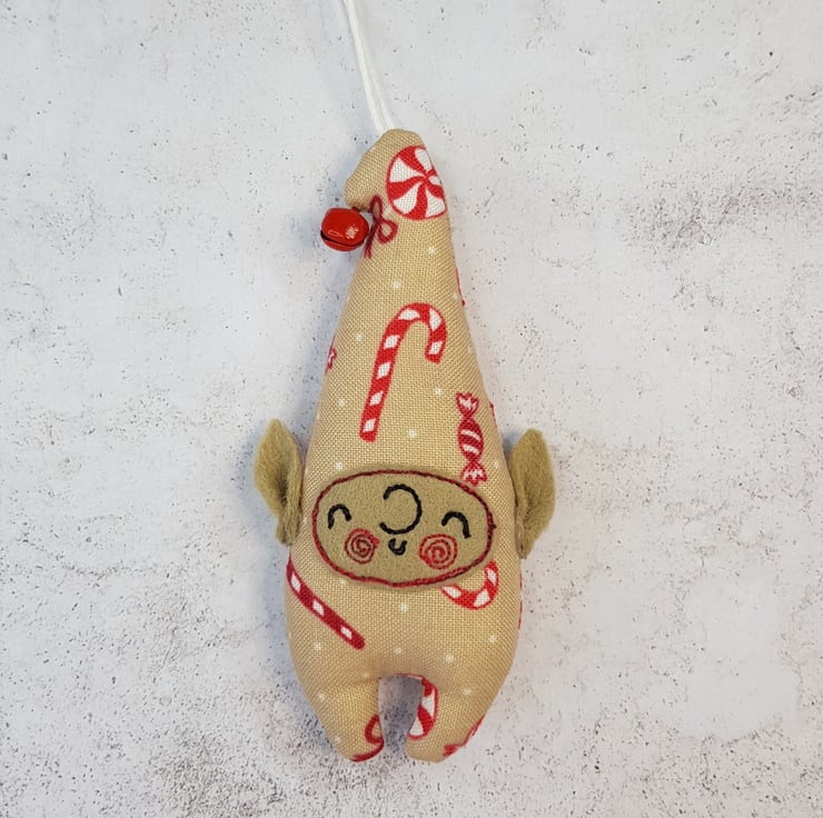 Cute little elf measuring roughly 10cm tall with a bell attached to its curly top. Elf is made from swirly candy cane sweet printed cotton with free motion embroidered felt face and Hand cut pointy felt ears are attached. Elf also has a wax thread hanger. This listing is for one elf. Sent in recyclable packaging.