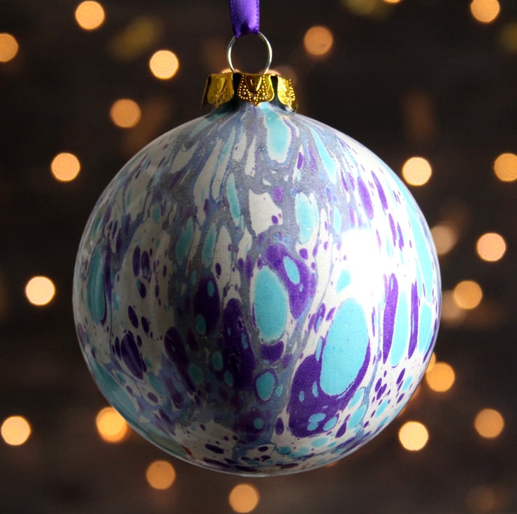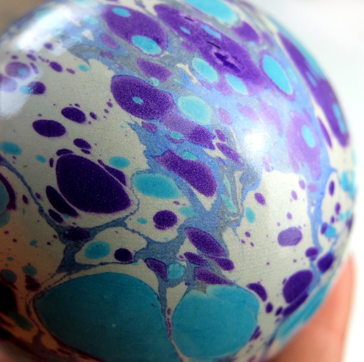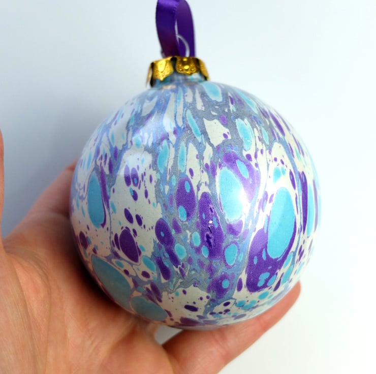 One of my luxury large bauble range, this features a stone pattern with metallic blue veins and purple silver and turquoise spots in varying sizes.