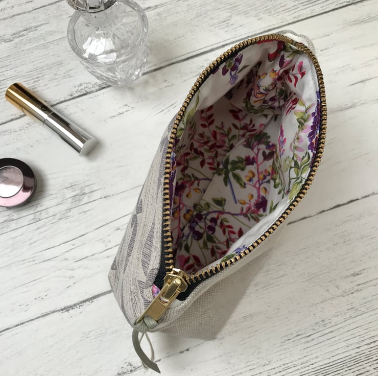A lovely hand printed Zipped Cosmetic Bag. This would make an ideal gift or a treat for yourself and is perfect for carrying cosmetics or jewellery