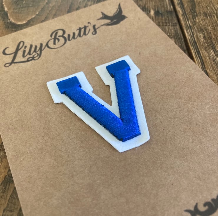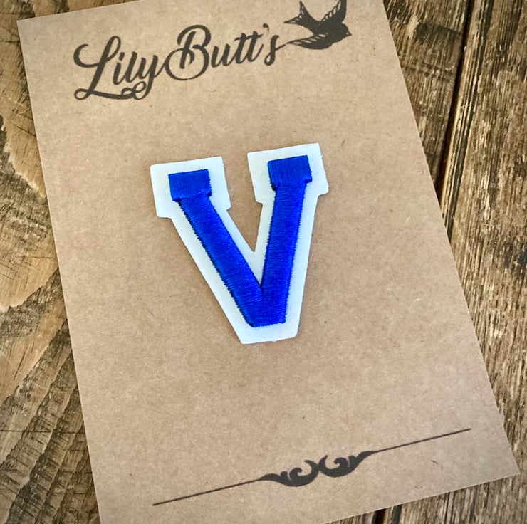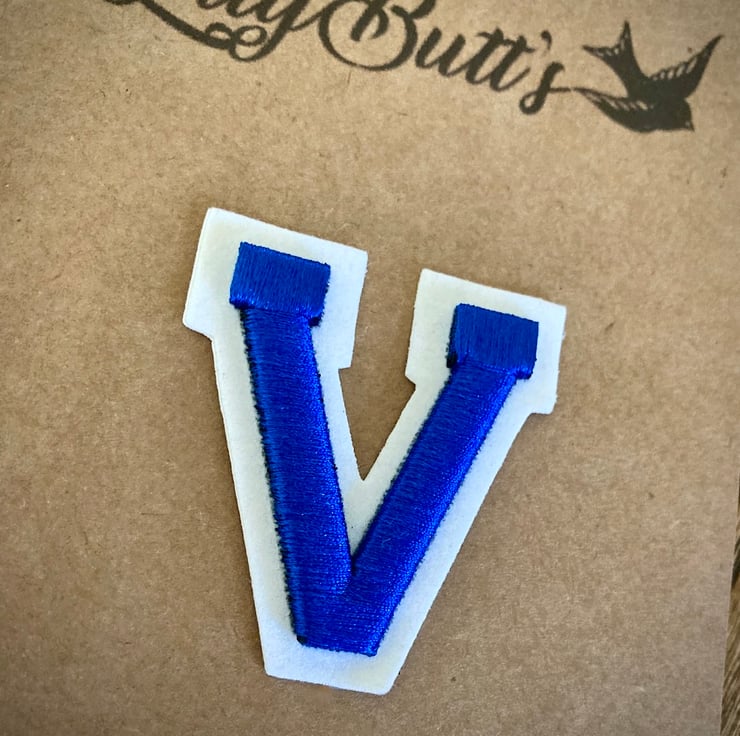 Embroidered Iron on Patch - Letter V - 50mm x 40mm. Blue with a white edge. These really a chunky classic, sports shirt letter. Comes with ironing instructions, but I also add some concealed stitches to make sure it's attached, especially when using on children's clothes etc.