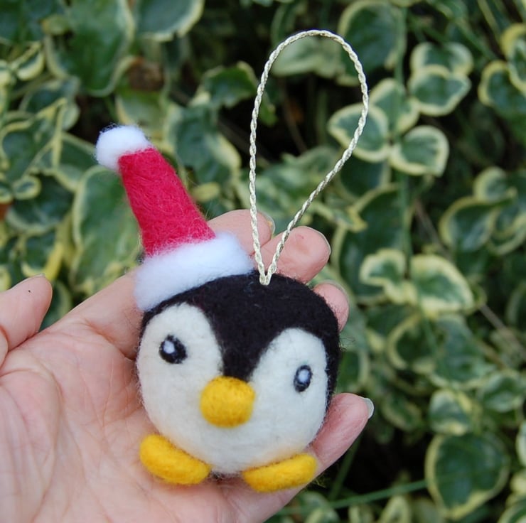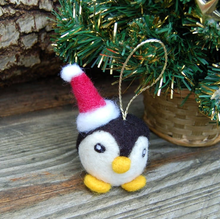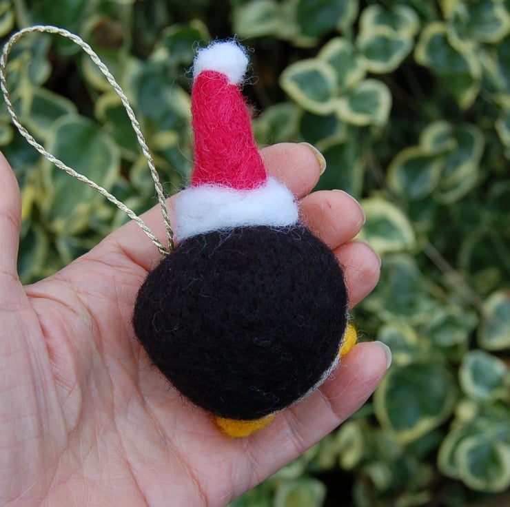 A cute Christmas Tree bauble. A penguin made from unspun wool fibres with a gold trim hanger from my stash of bits and bobs.