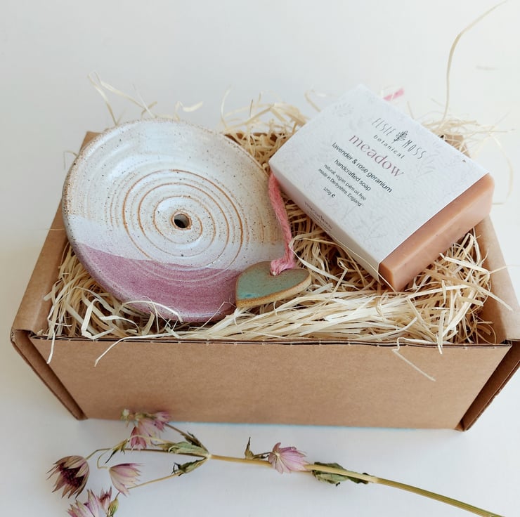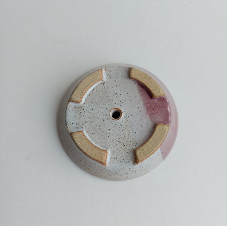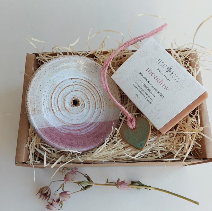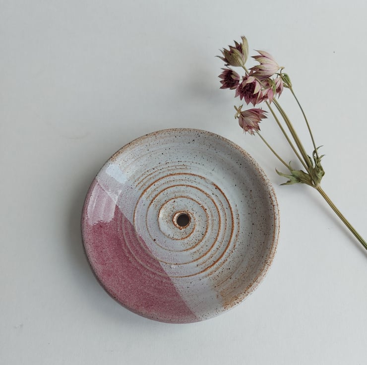 The soap dish is dipped in a Hathersage Pink glaze and white. The glaze varies in colour depending on its position in the kiln, sometimes more blue and others more green in colour.