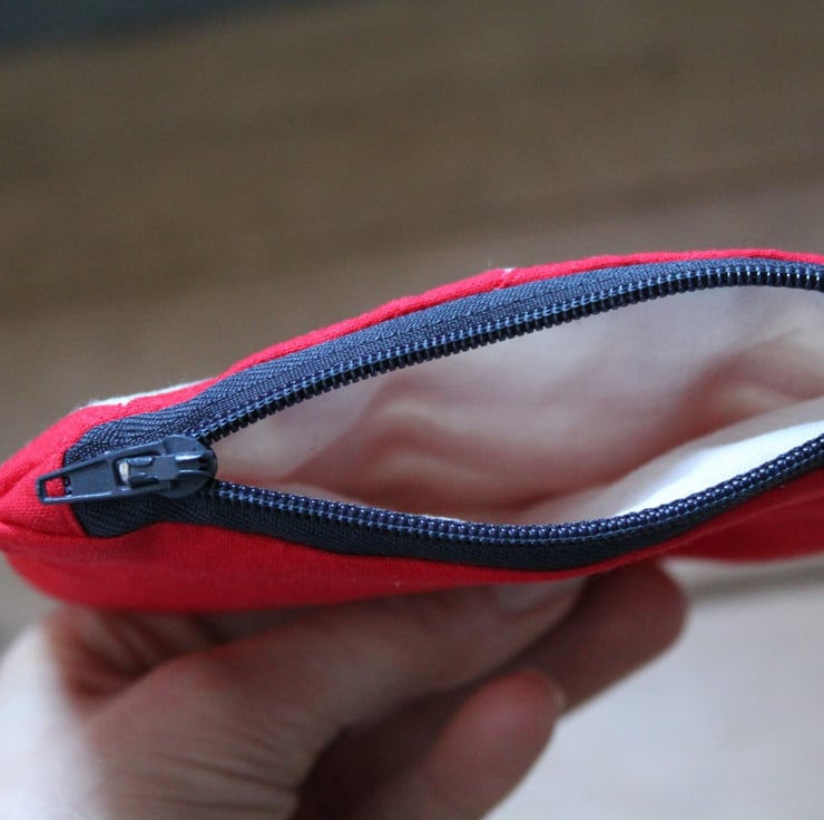 Made with 100% cotton on my vintage Jones grey and red sewing machine in the colours of red and natural with a dark grey zip and a natural lining.