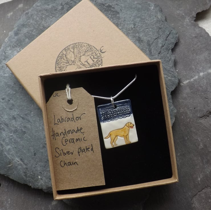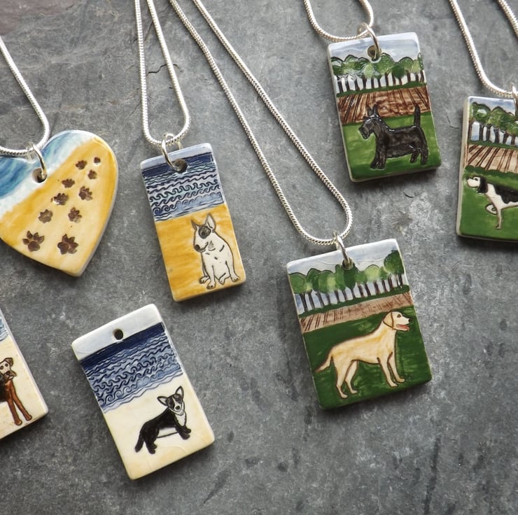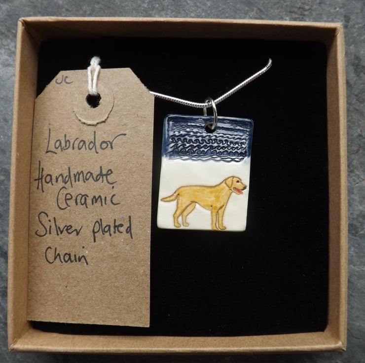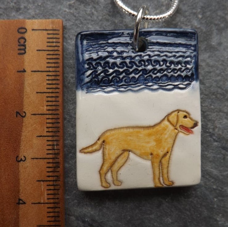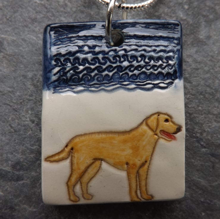 This pendant features a golden Labrador having a fun day out on the beach. As with all my jewellery it is made and decorated entirely by hand.