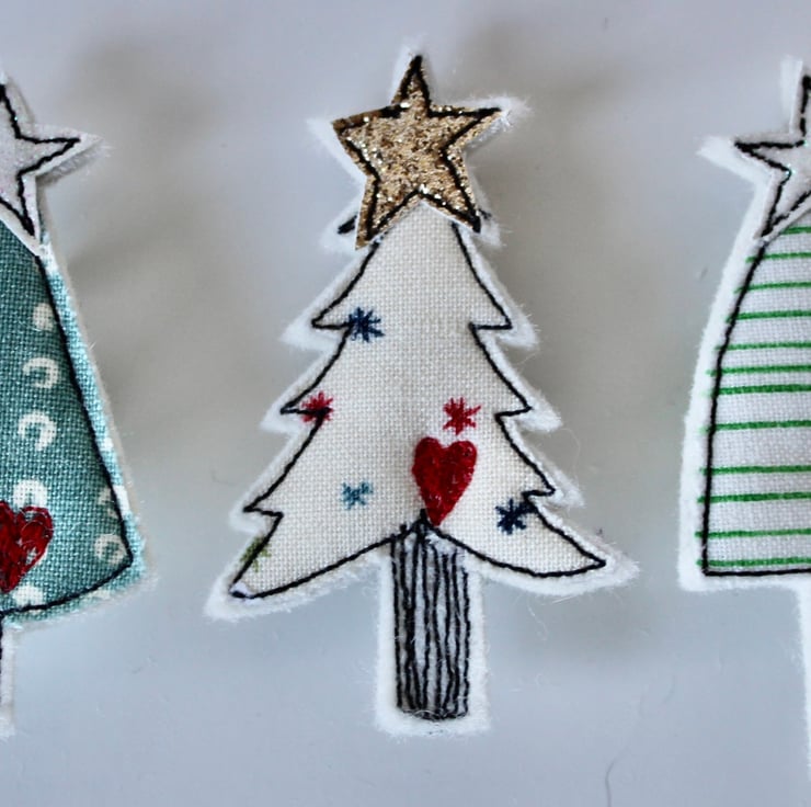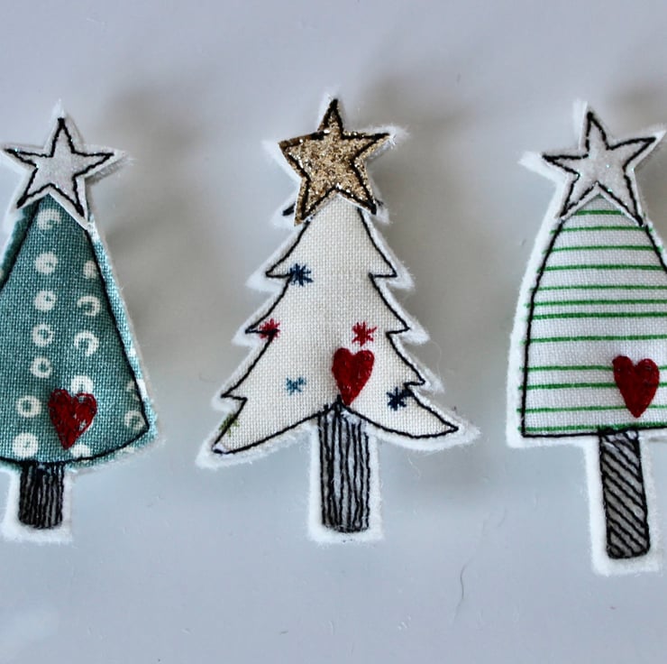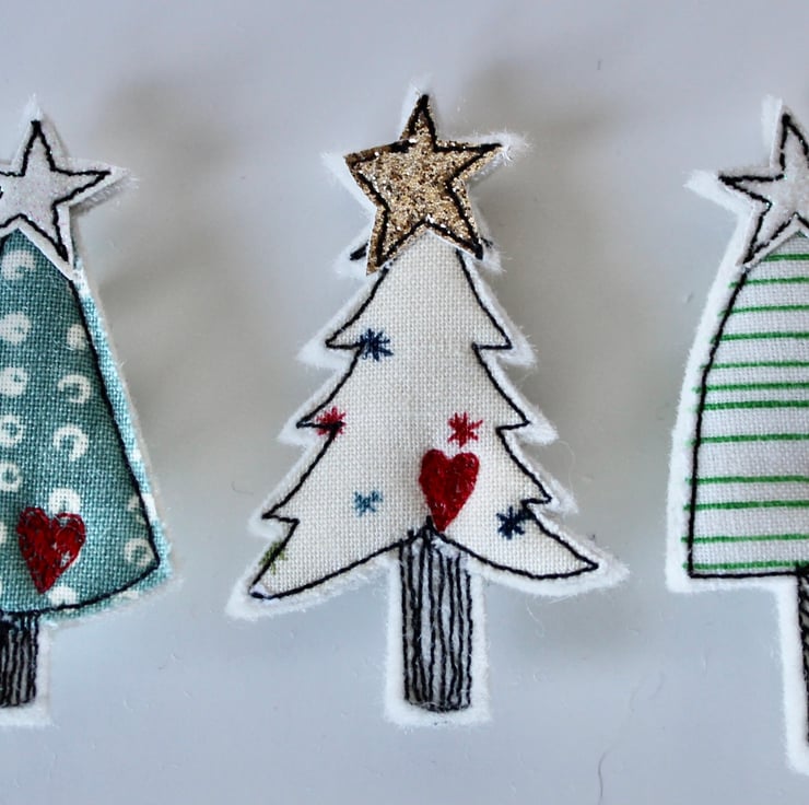 Christmas tree brooches are sewn using cotton cloth, glitter cloth and free hand machine embroidery; multiple layers of cloth are sewn together and cut out by hand using sharp scissors. The pin on the back of each is attached with hot glue and with a sewn fabric circle to secure.