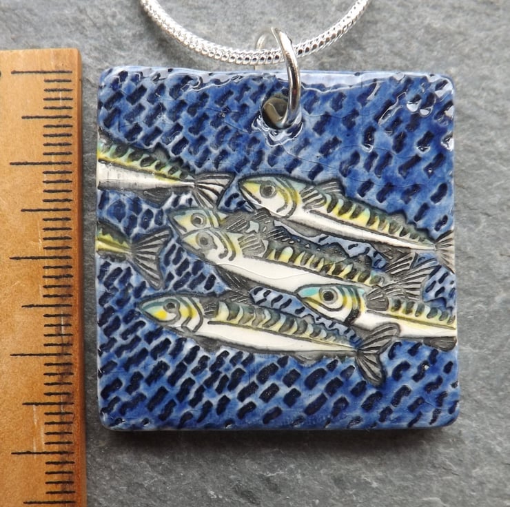This striking square pendant features a shoal of mackerel swimming through deep blue water, a snapshot of local marine wildlife.