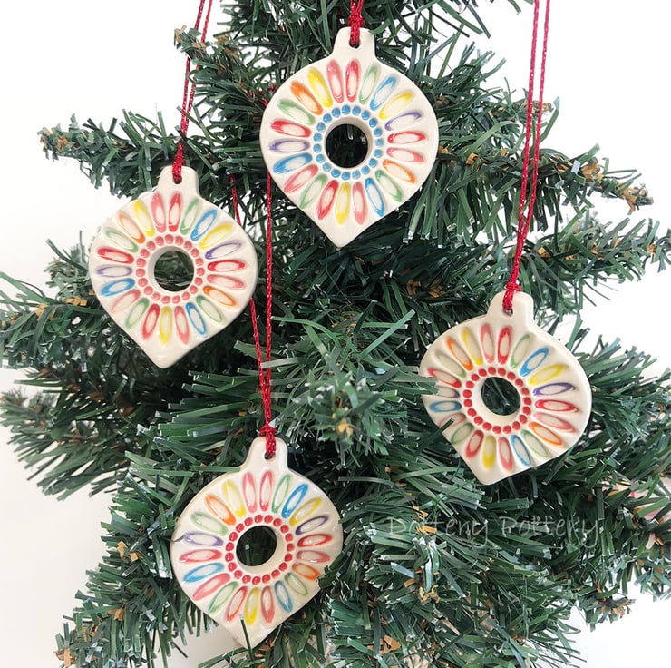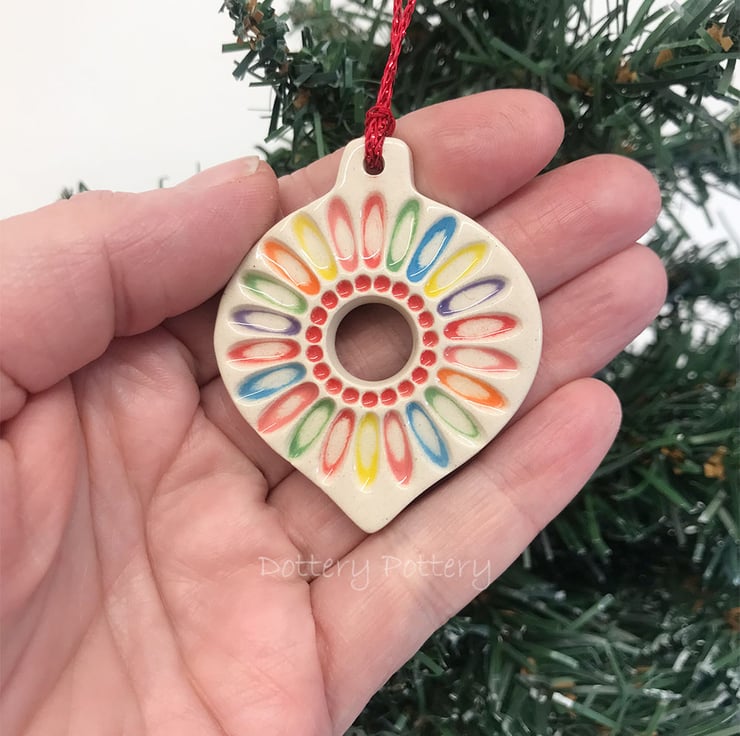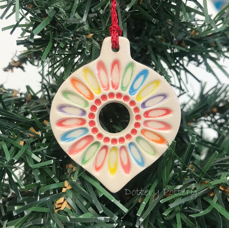 This ceramic bauble decoration has a lovely bright design in rainbow colours with a little hole in the middle. It's really cheerful! It is made from white earthenware clay and fired once, then glazed and fired again. It measures 5.5cm length and 4cm width and 0.5cm deep and hangs from a glittery red thread. The little round pattern around the hole comes in a variety of colours, so you will get one bauble chosen at random. This is for ONE bauble, the last photo is to show how it could look if you hang more than one on the tree.