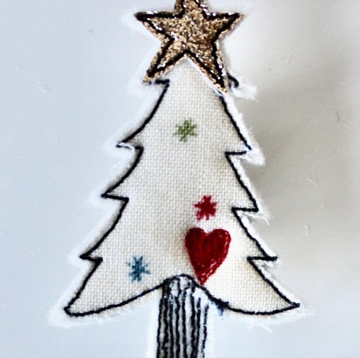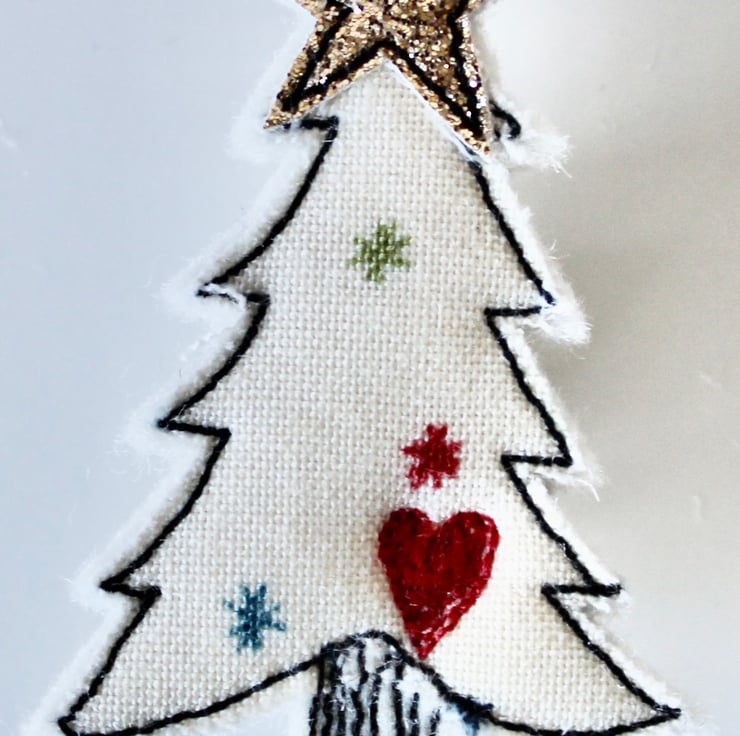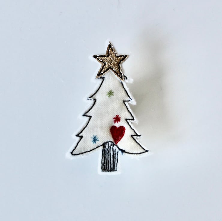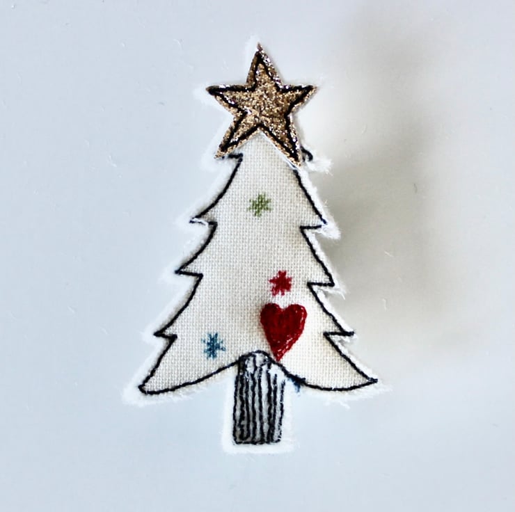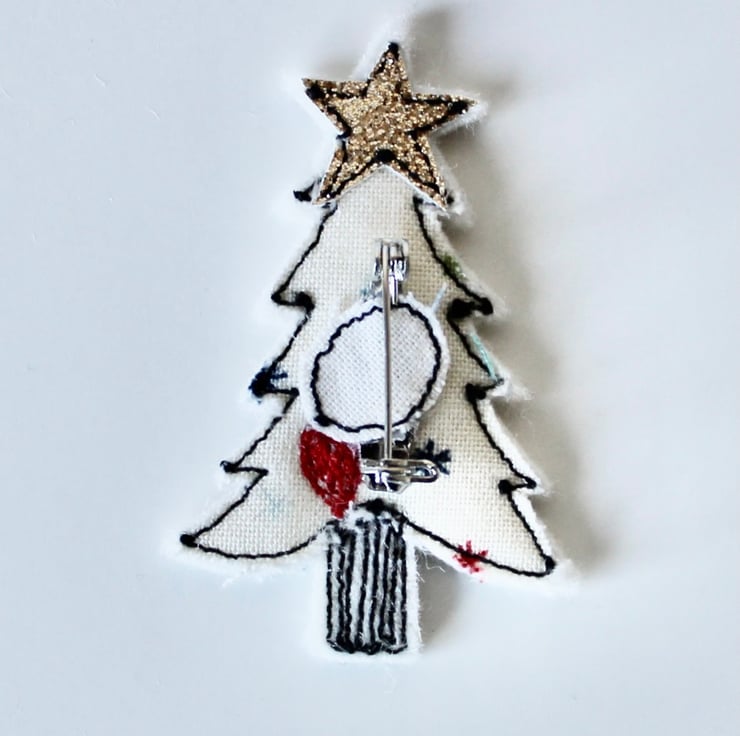 Christmas tree brooches are sewn using cotton cloth, glitter cloth and free hand machine embroidery; multiple layers of cloth are sewn together and cut out by hand using sharp scissors. The pin on the back of each is attached with hot glue and with a sewn fabric circle to secure.