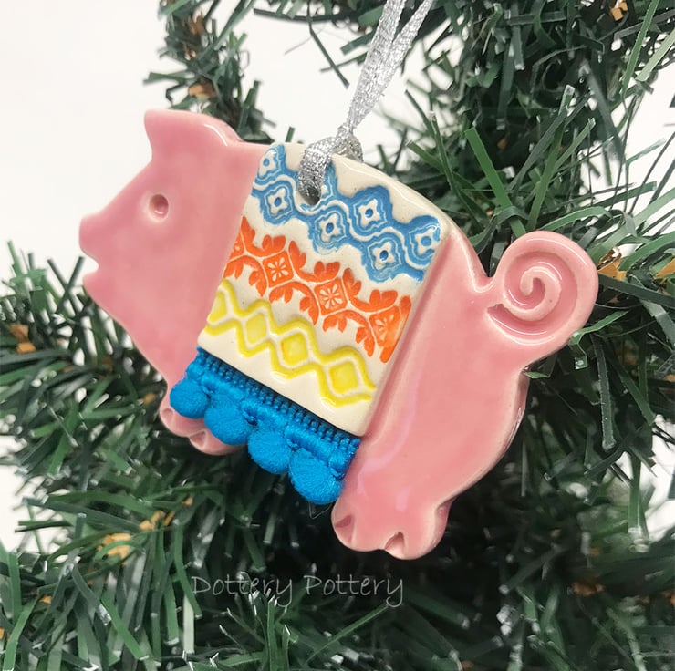 This cute little pig is made from white earthenware clay and decorated with pattern. It has been fired twice and finished with rich, glossy glazes and a textile pom-pom trim. Glazed on the front only. It measures 7.5cm x 5cm x 0.7cm deep and hangs from a silver string Each blanket is slightly unique, some are wider than others with a variety of patterns - you may not get exactly the one as shown in the photograph but it will be equally lovely. Last photo to show some of the designs - you will receive ONE pig only)