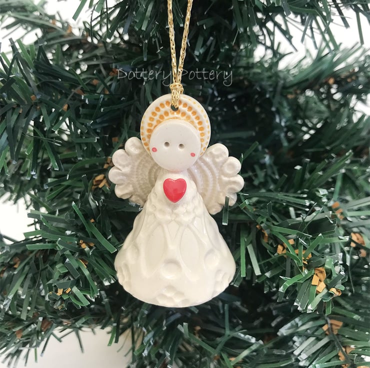 This tiny angel is made from white earthenware clay. She has a little cream dress and a cute little button detail at the back. She can hang from the Christmas tree or be a free standing ornament. She measures 5cm high x 4cm wide She's a little bit too wide to fit in a large letter parcel, (I blame all the mince pies!) so, she has to go as a small parcel but I hope you think she's worth the little bit of extra postage cost.