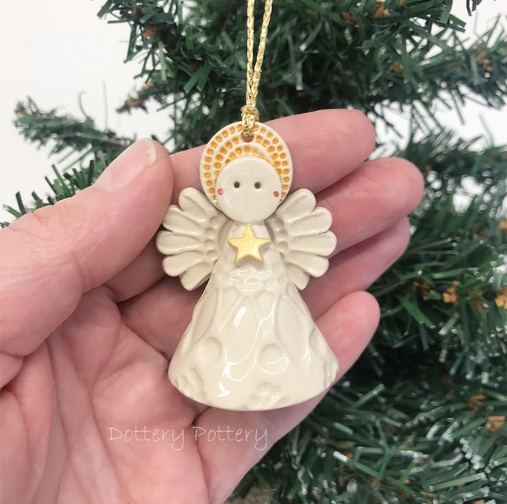This tiny angel is made from white earthenware clay. She has a little cream dress and a cute little button detail at the back. She can hang from the Christmas tree or be a free standing ornament. She measures 5cm high x 4cm wide She's a little bit too wide to fit in a large letter parcel, (I blame all the mince pies!) so, she has to go as a small parcel but I hope you think she's worth the little bit of extra postage cost.
