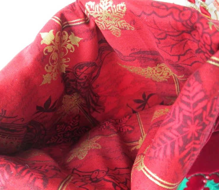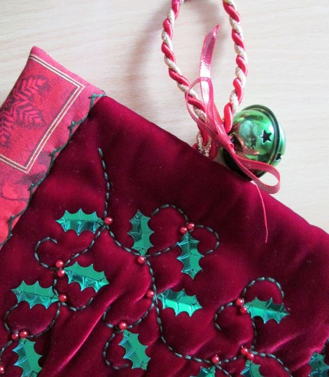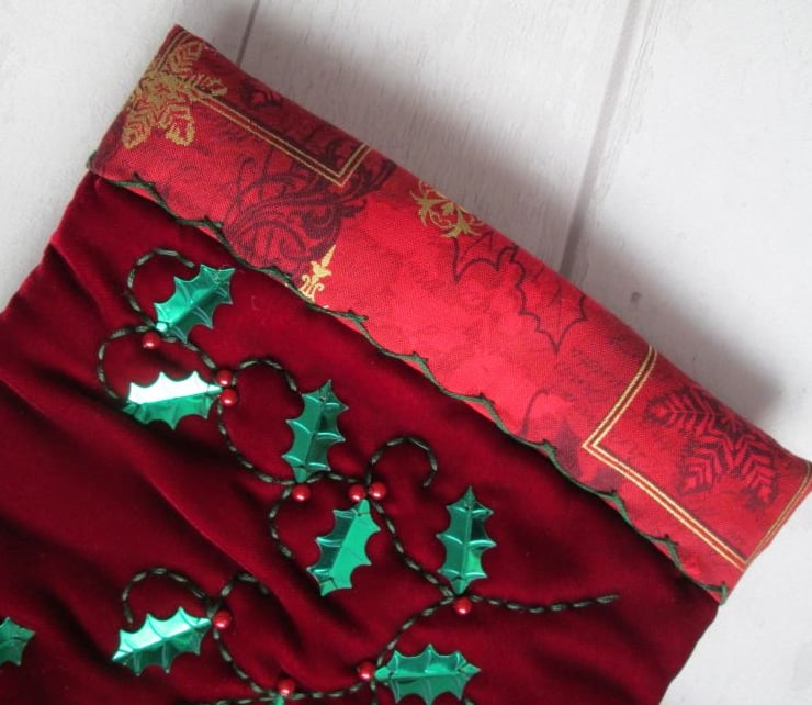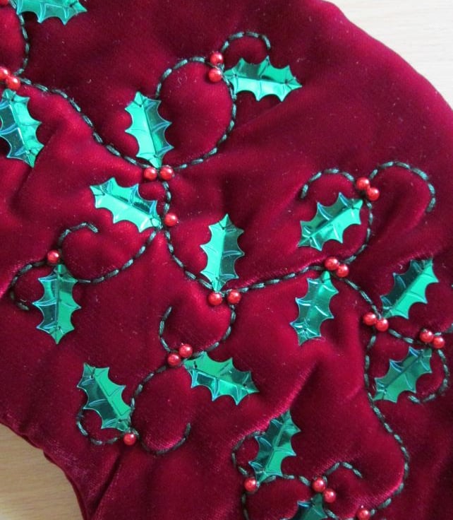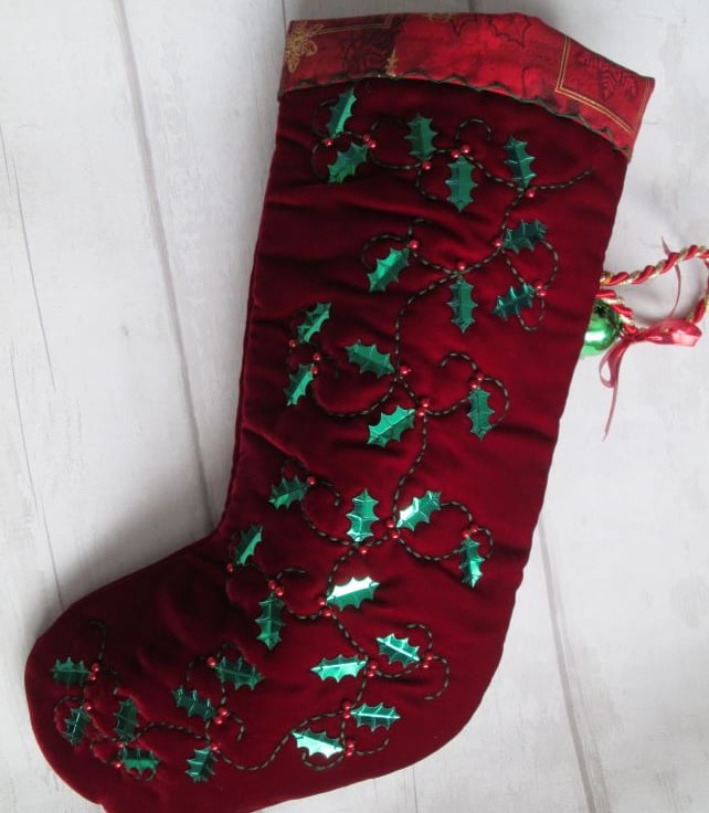 A one-off luxury Christmas stocking in rich red velvet, hand embellished with tendrils of holly. The green sequin holly leaves are finished with bead berries and the stocking has been lined with a lovely red festive print with gold metallic highlights. Finished with a coordinating cord hanging loop and a green metal bell this would be a very special stocking to delve into on Christmas morning.