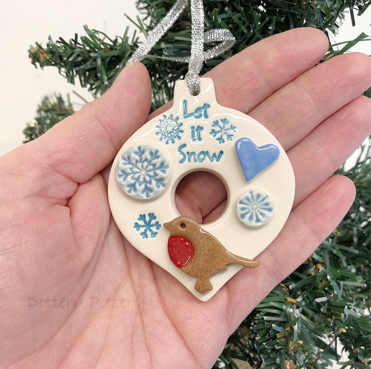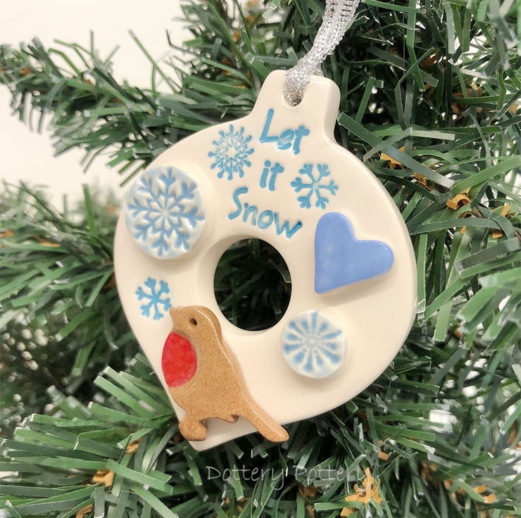 This ceramic bauble decoration has an imprinted Let it snow design, with raised snowflakes, icy blue heart and a little robin.It is made from white earthenware clay and fired once, then glazed and fired again. They measure 7cm length and 6cm width and 1cm deep, They hang from a silver ribbon, Glazed on the front only