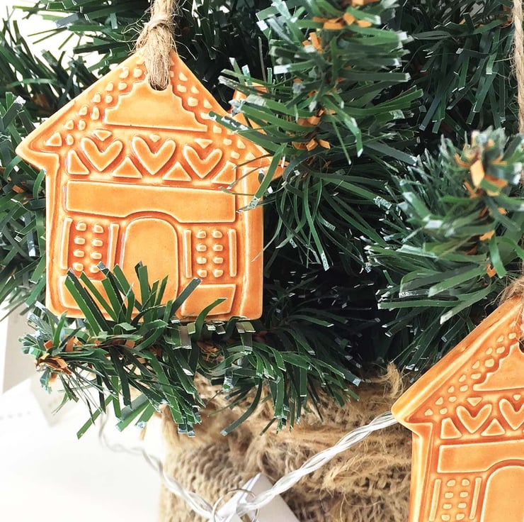 This is the price for ONE decoration. This little pottery gingerbread house decoration is made from white earthenware clay and glazed in a lovely glossy, buttery brown glaze. It has been fired twice. It measures 7.5 x 7cm and hangs from rustic brown string