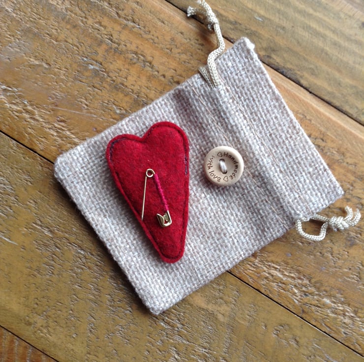 This felt heart shaped brooch is embellished with Liberty print fabric, crochet lace, an embroidered button meadow and a silver metal butterfly charm. It has a s heart shaped stiffening sandwiched between the two layers of felt to help it keep its shape.