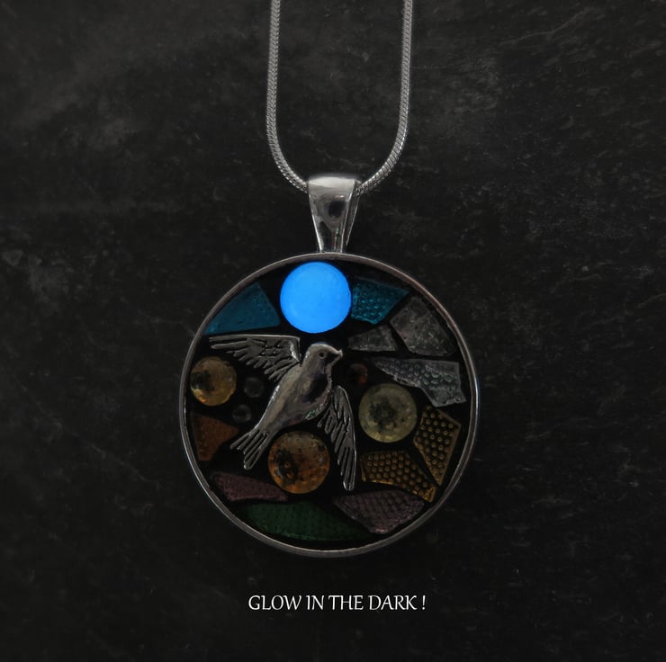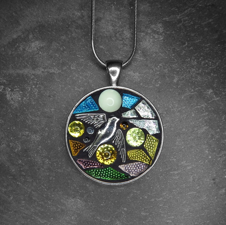 A pretty stained glass and bead pendant featuring a tiny bird flying high in a summer sky.