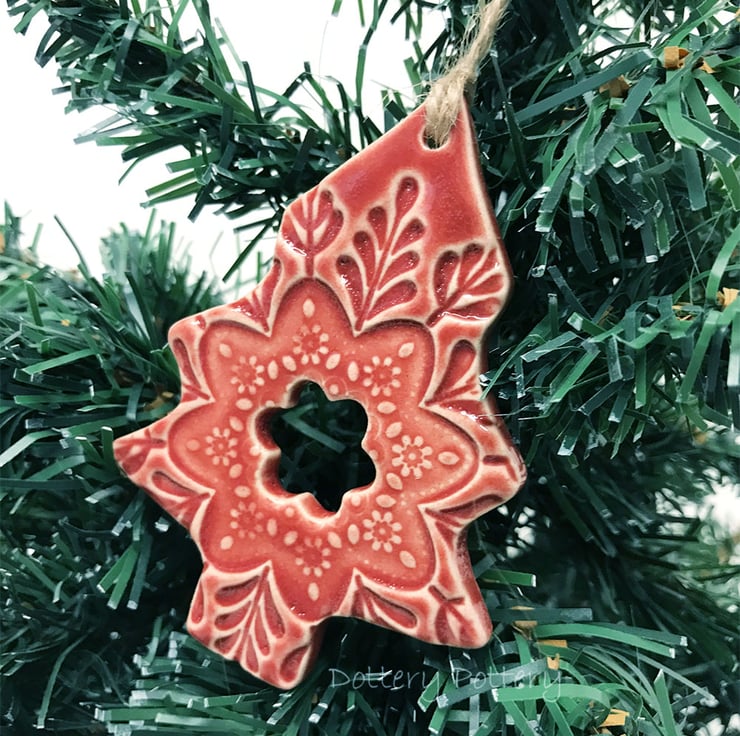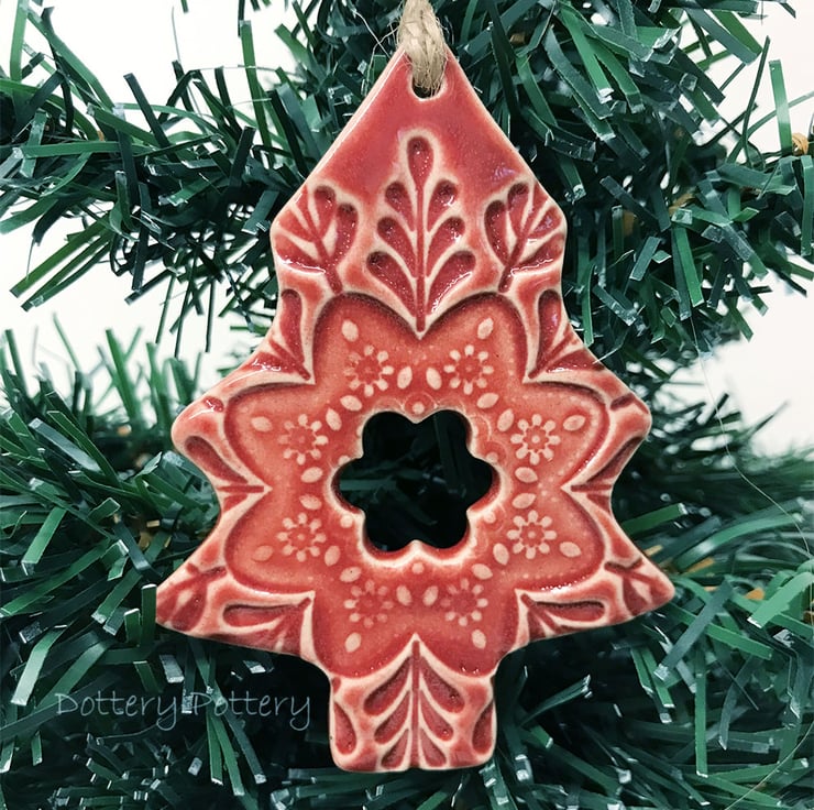 This highly decorative Christmas tree is made from white earthenware clay. It has been imprinted with pattern and has been fired twice and finished with a rich, glossy glaze. The back is plain and unglazed. It measures 8cm x 6cm and hangs from a brown string