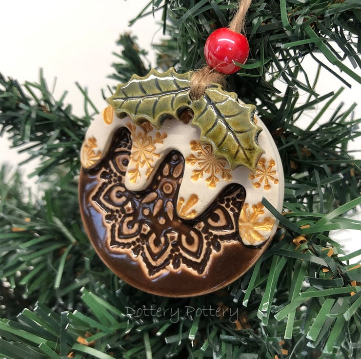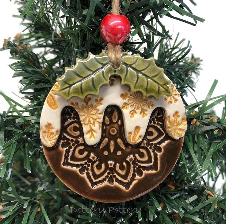 These cute little Christmas puddings are made from white earthenware clay. Each part is hand cut, embossed and put together with care and attention to detail. It is then fired and glazed, then fired again. The little snowflakes have a golden shimmer. It hangs on a rustic brown string - ready to hang on your tree. Each decoration measures 5.5cm diameter and is glazed in the front only.