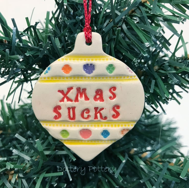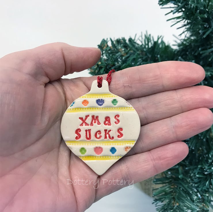 This ceramic bauble decoration has the words Xmas Sucks on the front. Send it to someone that is a bit bah humbug about the festive season. It is made from white earthenware clay and fired once, then glazed and fired again. It measures 5.5cm length and 4cm width and 0.5cm deep and hangs from a glittery red thread. The words may not be absolutely straight but it says what you need it to say!