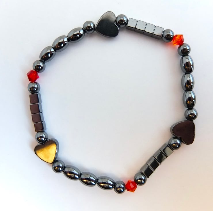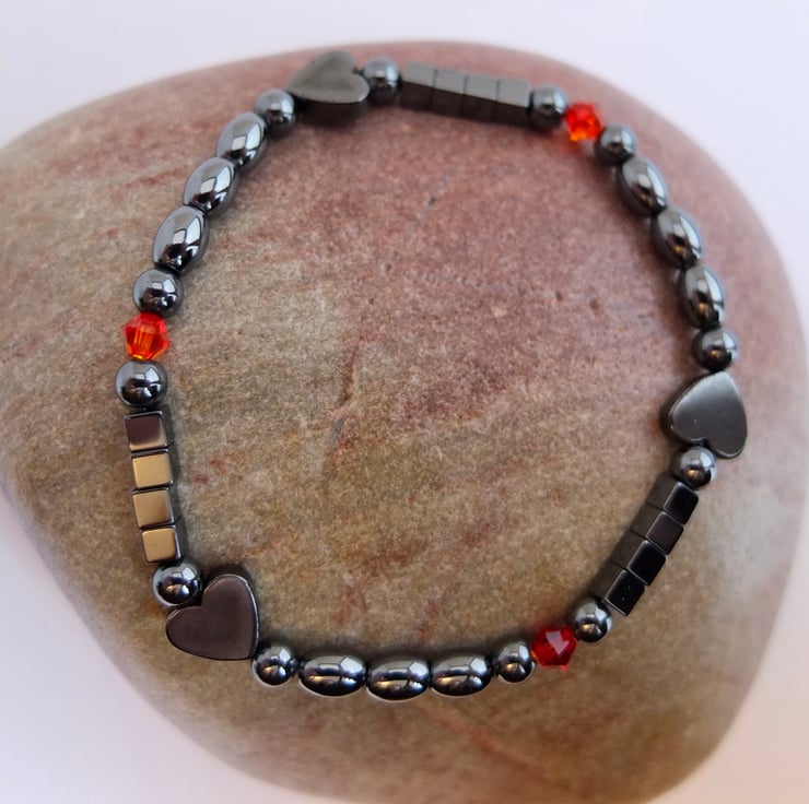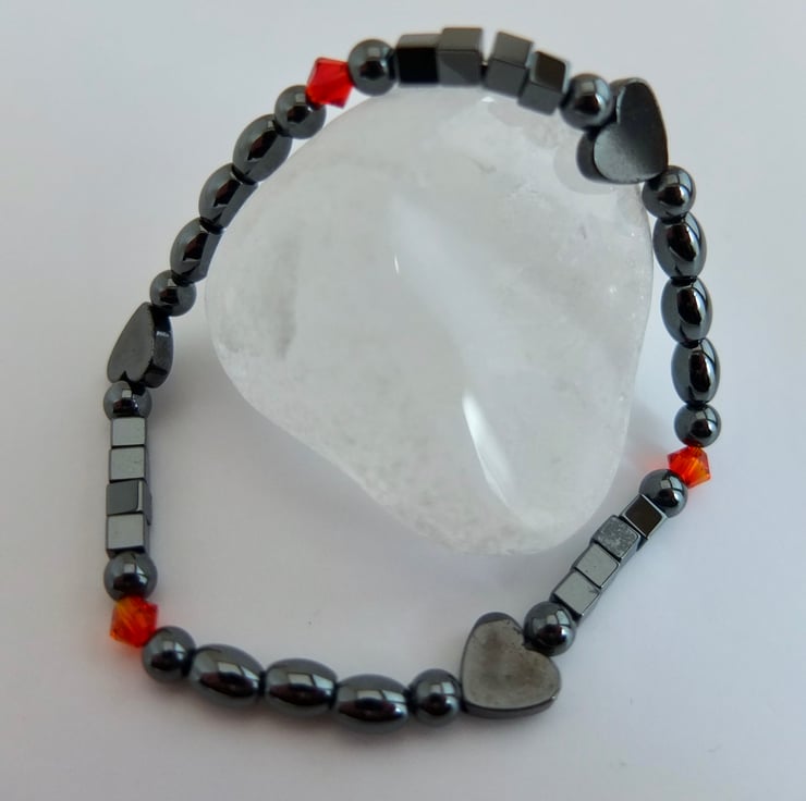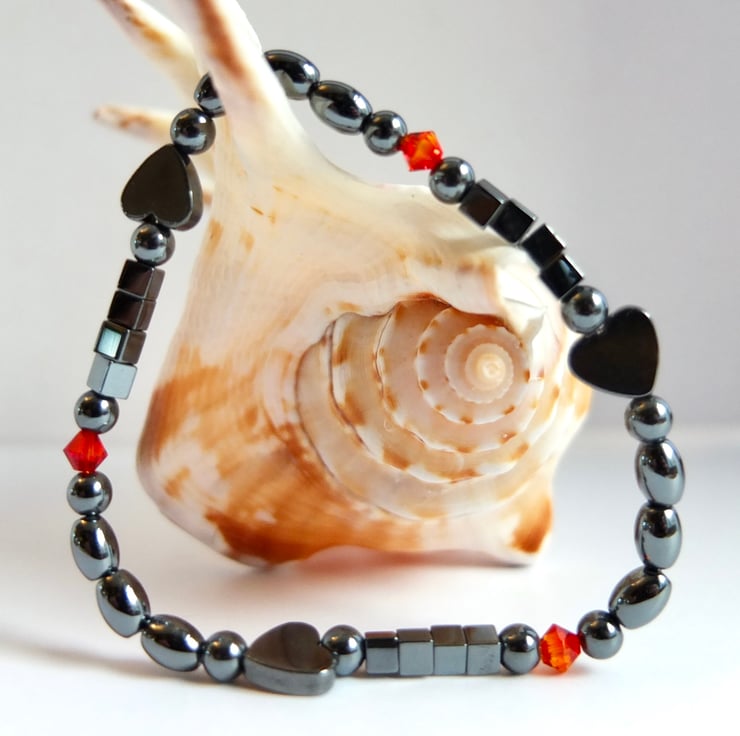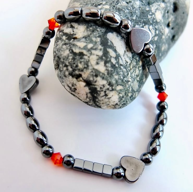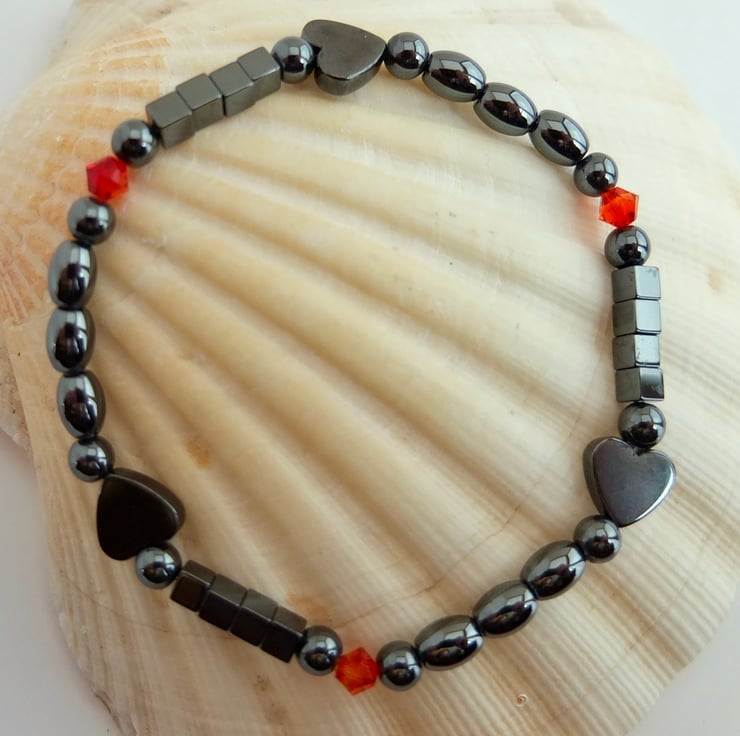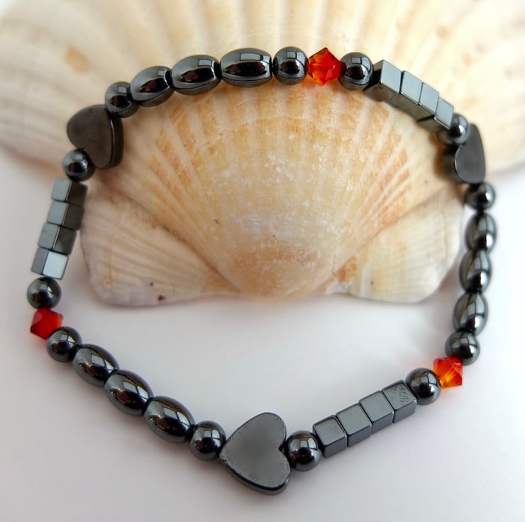 Hematite Heart Bracelet With Swarovski Fire Opal Crystals - Handmade in Devon.
